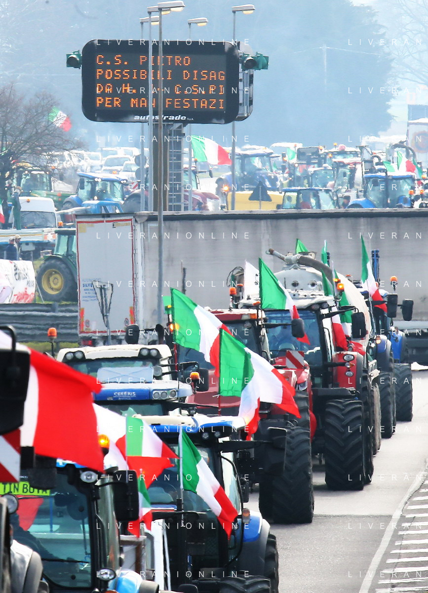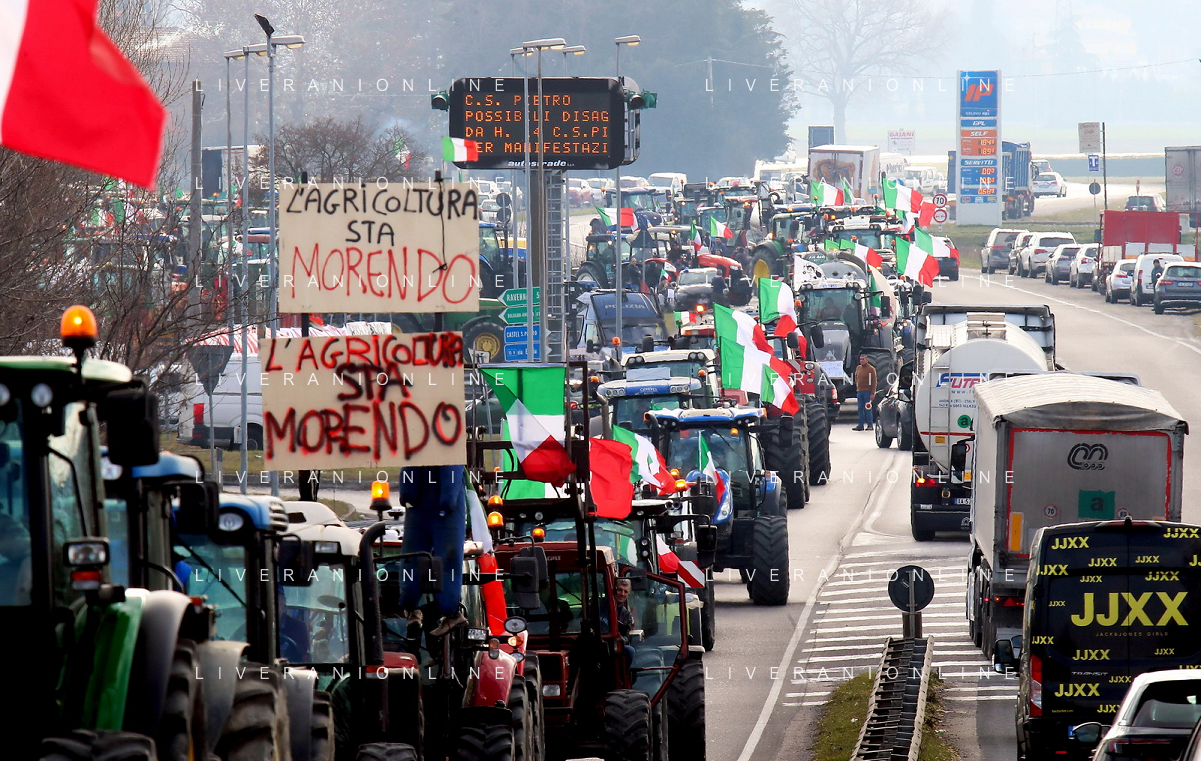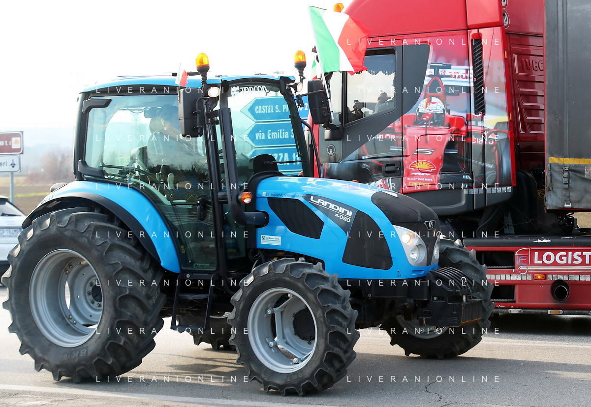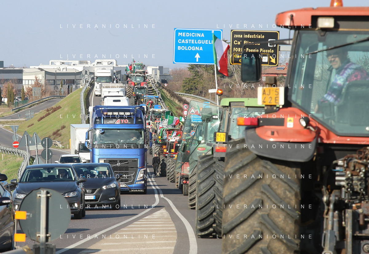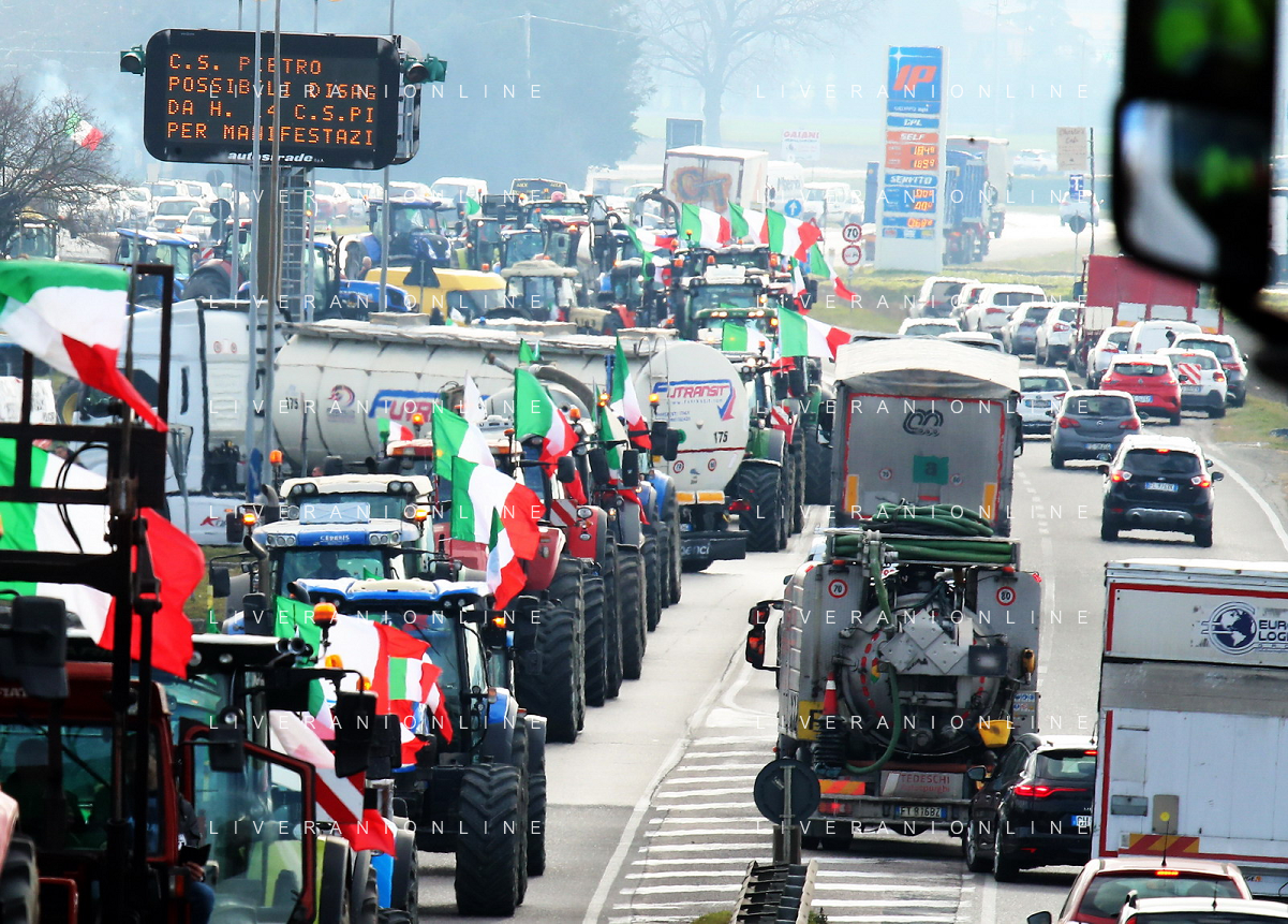 CASTEL SAN PIETRO 08 02 2024 PROTESTA DEGLI AGRICOLTORI PRESSO IL CASELLO DELL'AUTOSTRADA DI CASTEL SAN PIETRO CONTRO LE NUOVE NORME D'EUROPA FOTO GIANNI SANNA-AG ALDO LIVERANI SAS