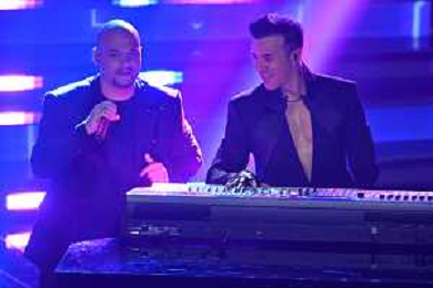 Festival Sanremo 2024 nella foto Fred De Palma con gli Eiffel 65 74mo Festival della Canzone Italiana - Quarta Serata Teatro Ariston - Sanremo (IM) 09-02-2024 foto Roberto Garavaglia/agenzia Aldo Liverani sas/AGENZIA ALDO LIVERANI SAS