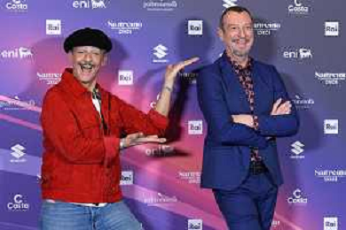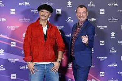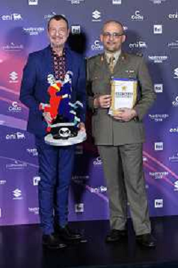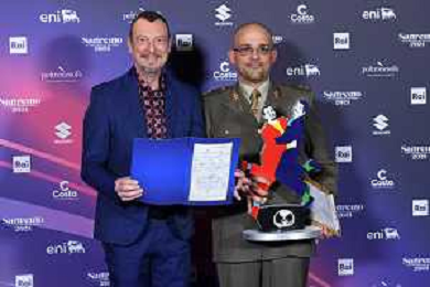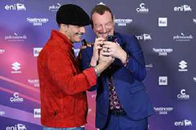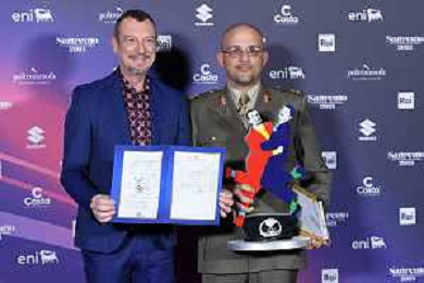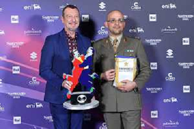 Festival Sanremo 2024 nella foto Amadeus con il maggiore Filippo Cangiamila maestro direttore della banda dell'Esercito Italiano, che ha consegnato ad Amadeus il suo foglio matricolare 74mo Festival della Canzone Italiana, photocall del 10 febbraio Teatro Ariston - Sanremo (IM) 10-02-2024 foto Roberto Garavaglia/agenzia Aldo Liverani sas/AGENZIA ALDO LIVERANI SAS