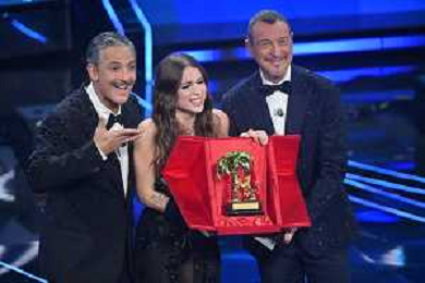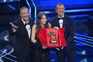 Festival Sanremo 2024 nella foto Angelina Mango vince il Festival di Sanremo 2024, con lei Fiorello e Amadeus 74mo Festival della Canzone Italiana - Quinta Serata Teatro Ariston - Sanremo (IM) 10-02-2024 foto Roberto Garavaglia/agenzia Aldo Liverani sas