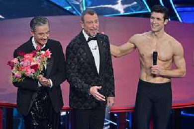 Festival Sanremo 2024 nella foto da SX Fiorello, Amadeus e Roberto Bolle 74mo Festival della Canzone Italiana - Quinta Serata Teatro Ariston - Sanremo (IM) 10-02-2024 foto Roberto Garavaglia/agenzia Aldo Liverani sas/AGENZIA ALDO LIVERANI SAS