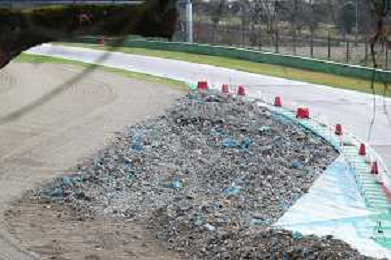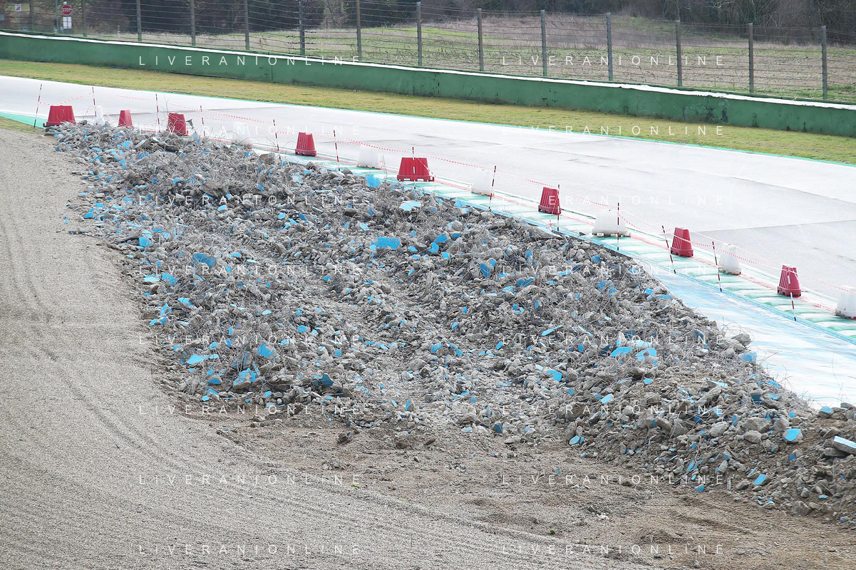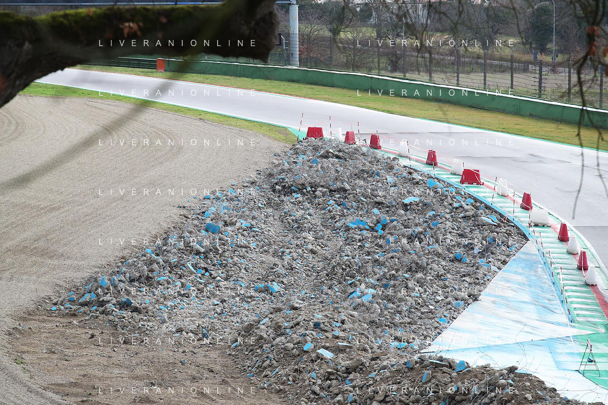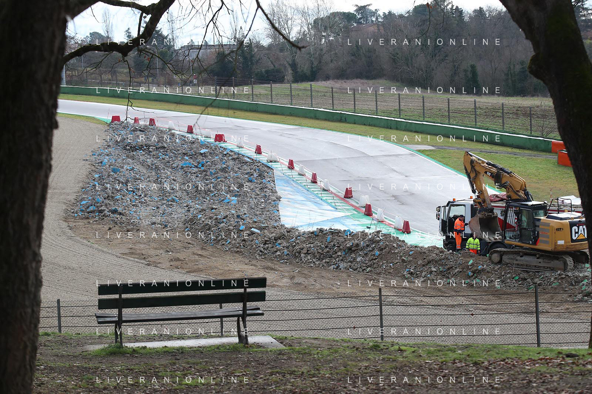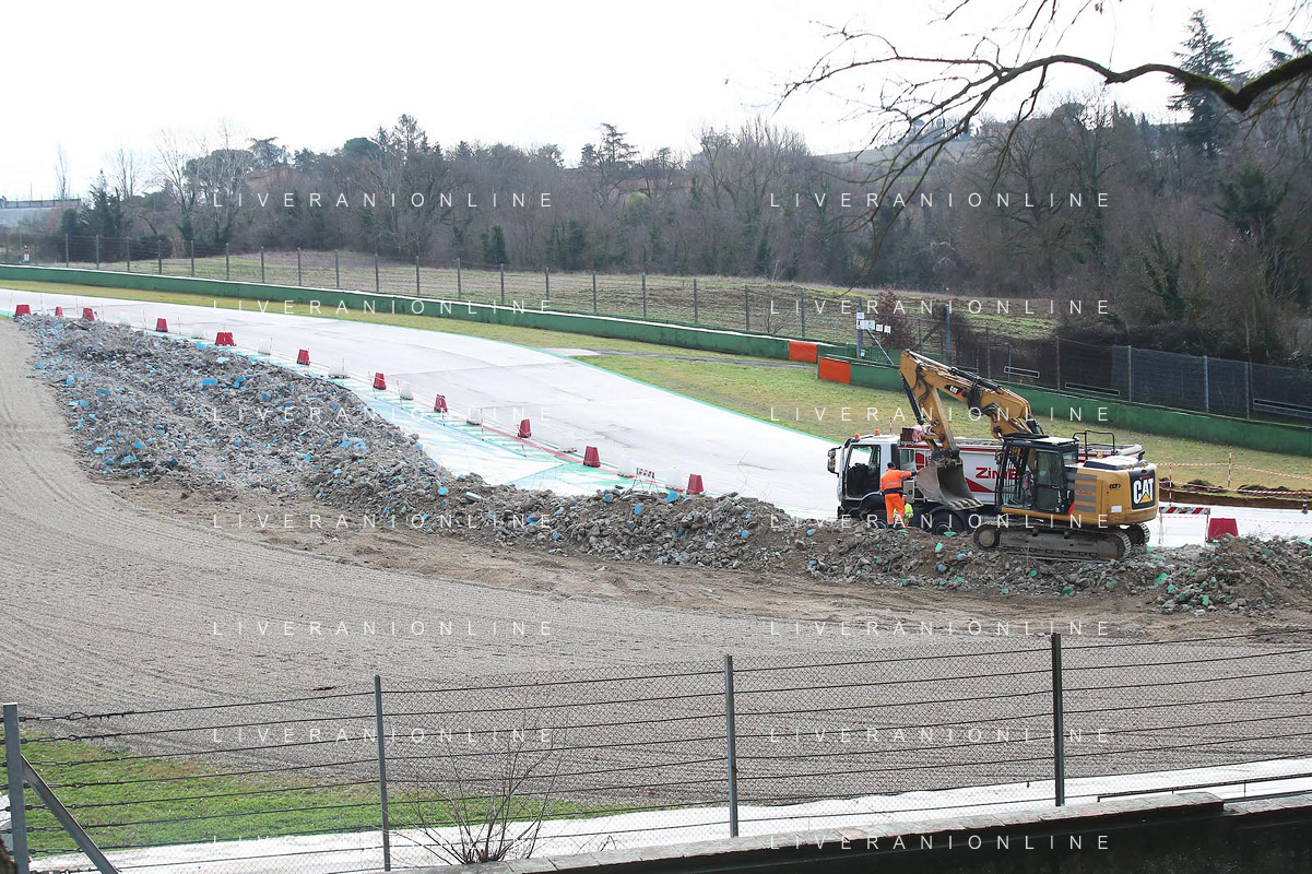 IMOLA 12 02 2024 AUTODROMO ENZO E DINO FERRARI NELLA FOTO LAVORI ALLA CURVA ACQUE MINERALI AL POSTO DEL CEMENTO TORNA LA GHIAIA PER LA SICUREZZA - 4 file