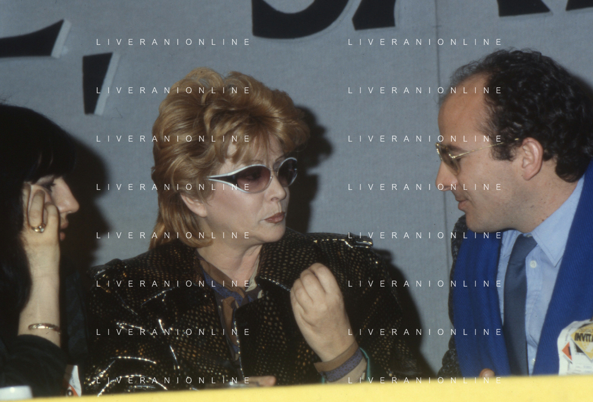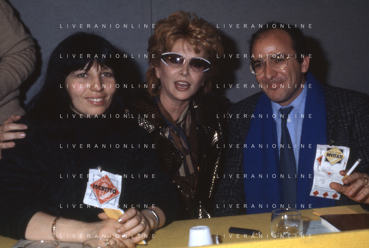 DIAP-RETROPETTIVA MIRANDA MARTINO ATTRICE E CANTANTE NELLA FOTO ENZO TORTORA CON MIRANDA MARTINI E PATRIZIA VILLA NELL'ANNO 1987 A MILANO AG ALDO LIVERANI SAS