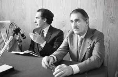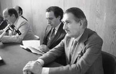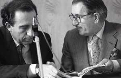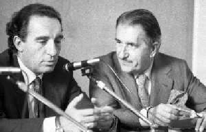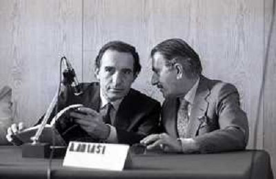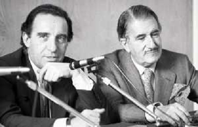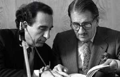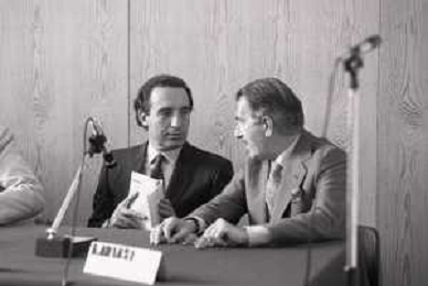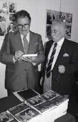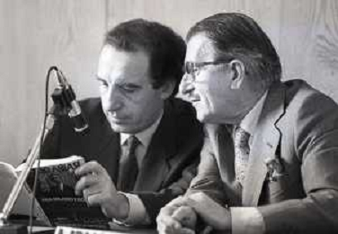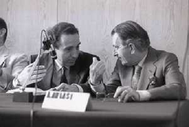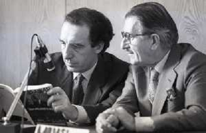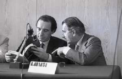 NEG- RETROSPETTIVA PAOLO PILLITTERI SINDACO DI MILANO E POLITICO PARTITO SOCIALISTA ITALIANO NELLA FOTO FRANCESCO ALBERONI NELL'ANNO 1987 ALLA PRESENTAZIONE DEL LIBRO DI ALDO ANIASI AG ALDO LIVERANI SAS