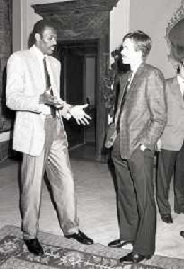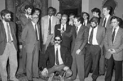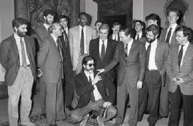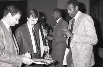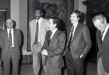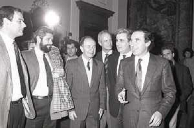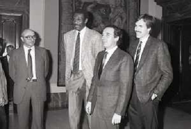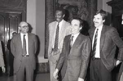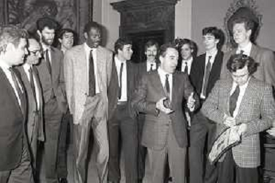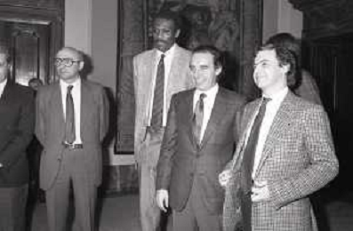 NEG- RETROSPETTIVA PAOLO PILLITTERI SINDACO DI MILANO E POLITICO PARTITO SOCIALISTA ITALIANO NELLA FOTO PAOLO PILLITTERI SINDACO DI MILANO A PALAZZO MARINO NELL'ANNO 1988 RICEVE I CAMPIONI D'EUROPA DELLA TRACER MILANO BASKET GABETTI-MIKE- D'ANTONI E BOB MC ADOO AG ALDO LIVERANI SAS