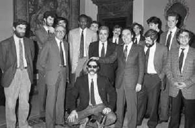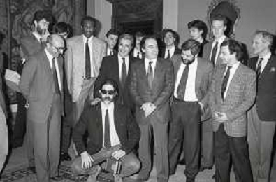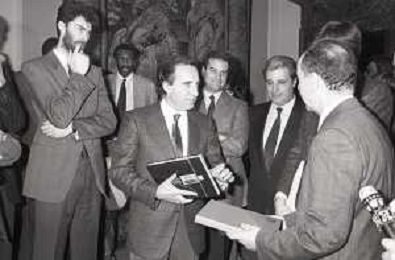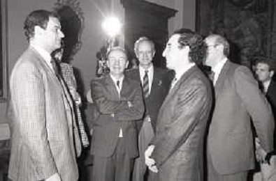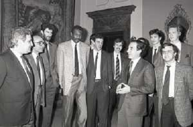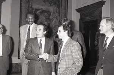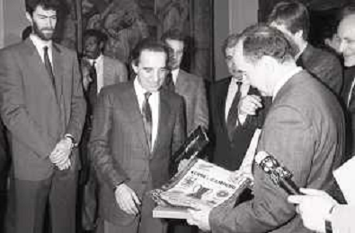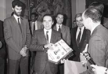 NEG- RETROSPETTIVA PAOLO PILLITTERI SINDACO DI MILANO E POLITICO PARTITO SOCIALISTA ITALIANO NELLA FOTO PAOLO PILLITTERI SINDACO DI MILANO A PALAZZO MARINO NELL'ANNO 1988 RICEVE I CAMPIONI D'EUROPA DELLA TRACER MILANO BASKET CON FABIO TREVES AG ALDO LIVERANI SAS