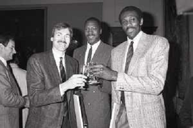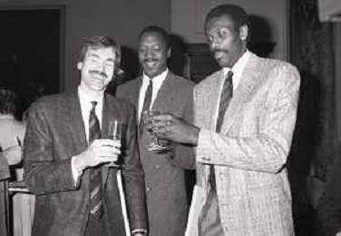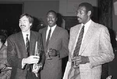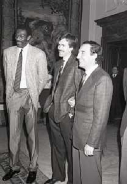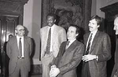 NEG- RETROSPETTIVA PAOLO PILLITTERI SINDACO DI MILANO E POLITICO PARTITO SOCIALISTA ITALIANO NELLA FOTO PAOLO PILLITTERI SINDACO DI MILANO A PALAZZO MARINO NELL'ANNO 1988 RICEVE I CAMPIONI D'EUROPA DELLA TRACER MILANO BASKET MIKE D'ANTONI-RICKEY BROWN E BOB MC ADOO AG ALDO LIVERANI SAS