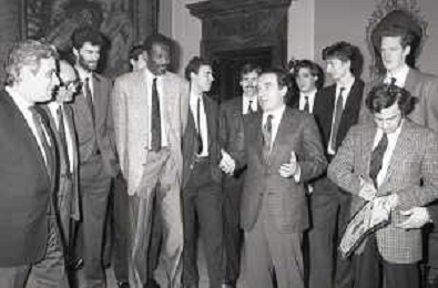 NEG- RETROSPETTIVA PAOLO PILLITTERI SINDACO DI MILANO E POLITICO PARTITO SOCIALISTA ITALIANO NELLA FOTO PAOLO PILLITTERI SINDACO DI MILANO A PALAZZO MAINO NELL'ANNO 1988 RICEVE I CAMPIONI D'EUROPA DELLA TRACER MILANO BASKET AG ALDO LIVERANI SAS