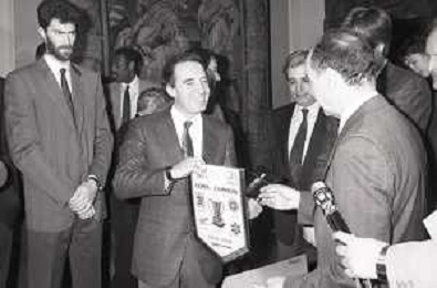 NEG- RETROSPETTIVA PAOLO PILLITTERI SINDACO DI MILANO E POLITICO PARTITO SOCIALISTA ITALIANO NELLA FOTO PAOLO PILLITTERI SINDACO DI MILANO A PALAZZO MARINO NELL'ANNO 1988 RICEVE I CAMPIONI D'EUROPA DELLA TRACER MILANO BASKET AG ALDO LIVERANI SAS