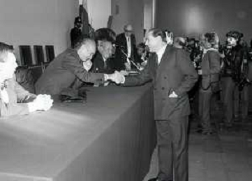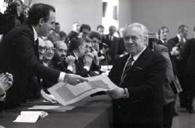 NEG- RETROSPETTIVA PAOLO PILLITTERI SINDACO DI MILANO E POLITICO PARTITO SOCIALISTA ITALIANO NELLA FOTO PAOLO PILLITTERI SINDACO DI MILANO A MLANO NELL'ANNO 1988 CONSEGNA DEGLI AMBROGINI D'ORO-NICOLA TRUSSARDI AG ALDO LIVERANI SAS
