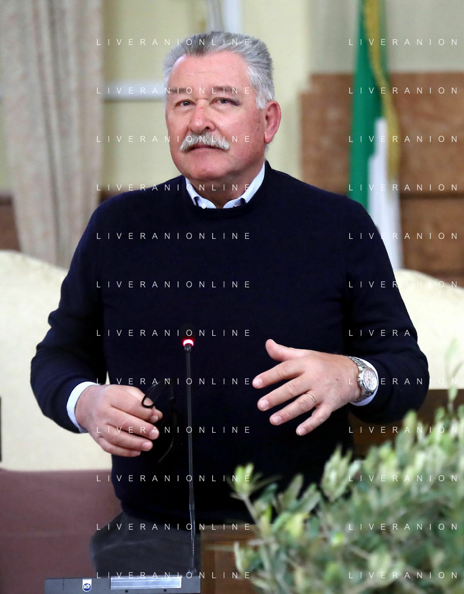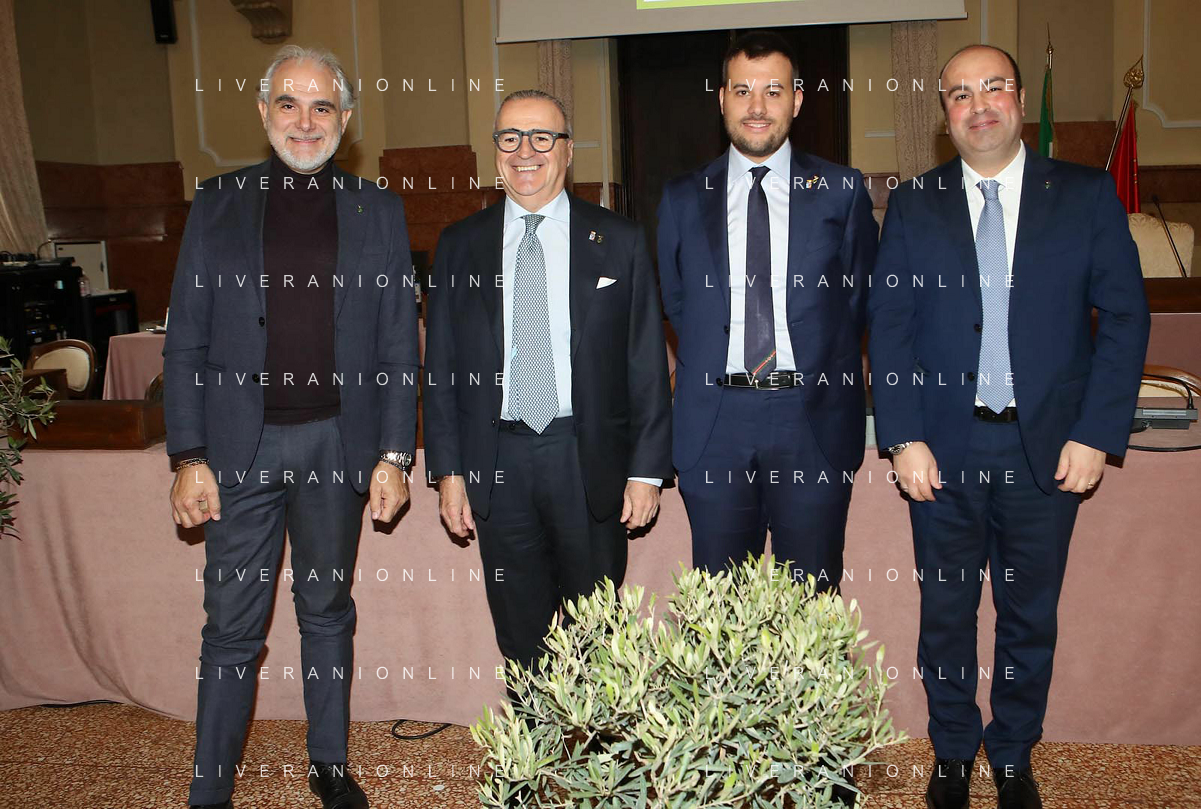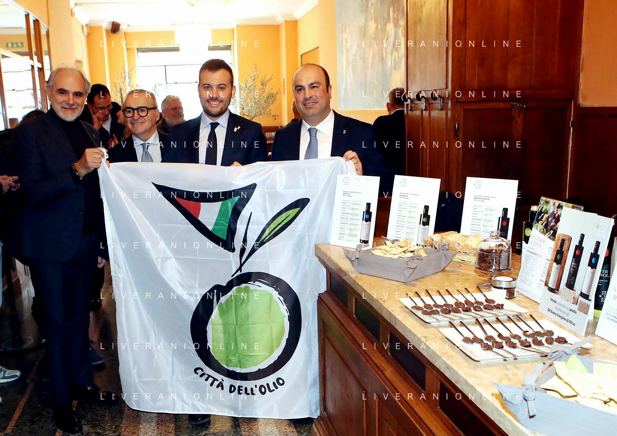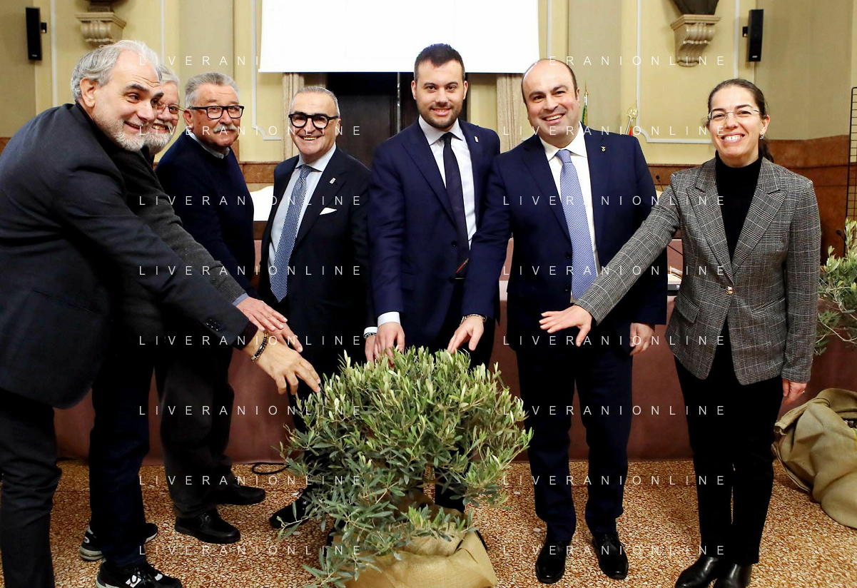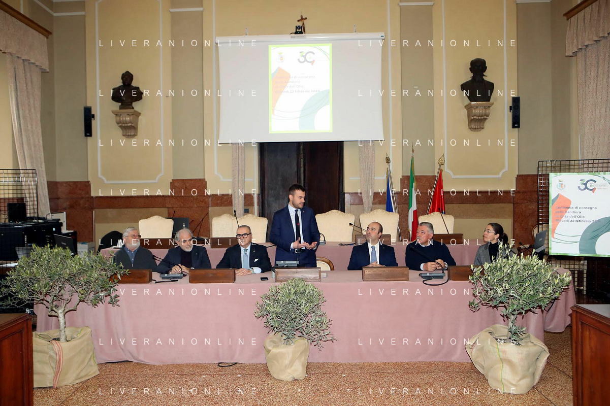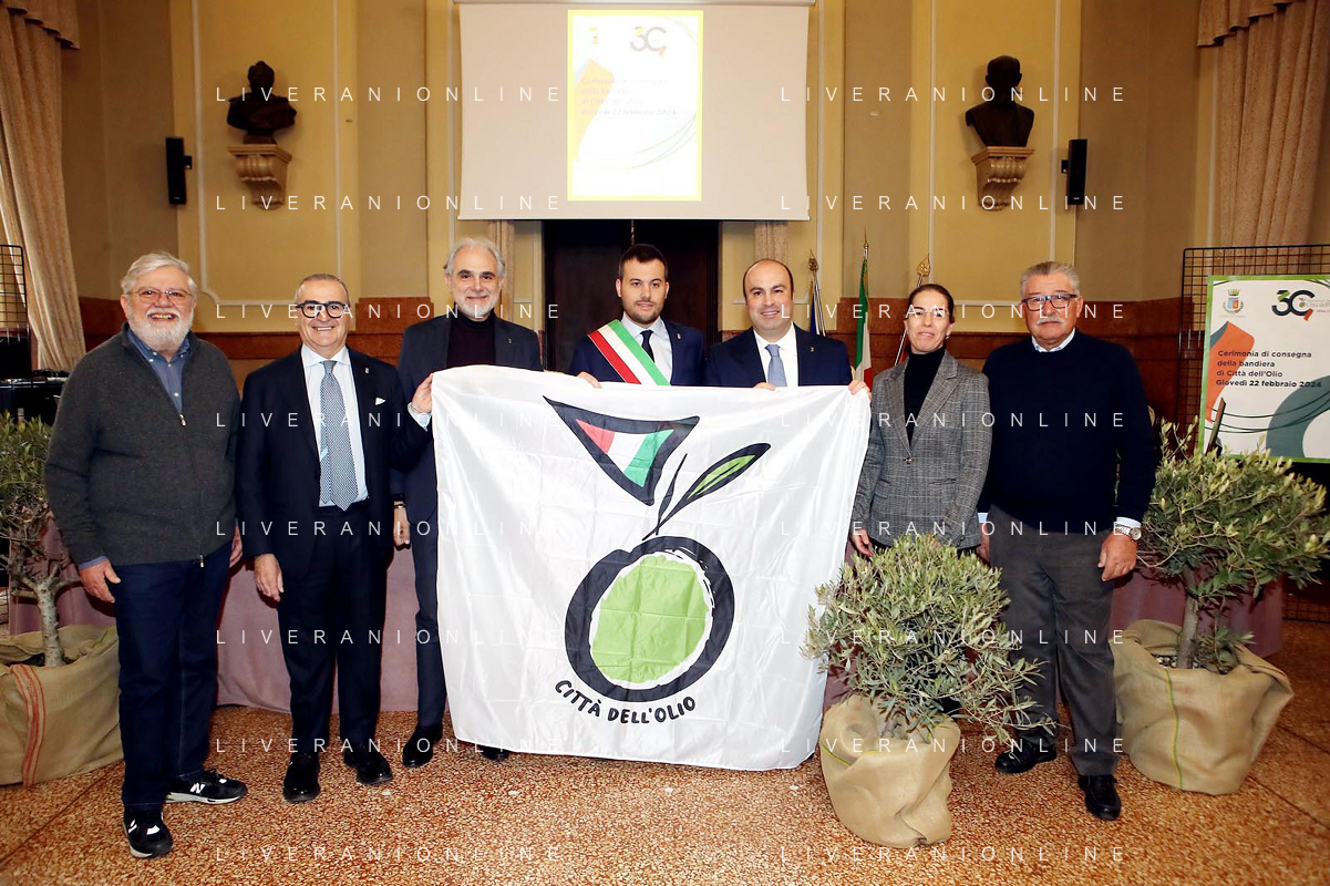 IMOLA 22 02 2024 in Municipio, il presidente dell'Associazione Nazionale, Michele Sonnessa, ha consegnato la bandiera al sindaco Marco Panieri IMOLA E' ENTRATA A FAR PARTE DELLE "CITTA' DELL'OLIO" NELLA FOTO GIOVANNI BETTINI CLAI IMOLA,ASSESSORE PIERANGELO RAFFINI,DIRETTORE ASS NAZIONE CITTA' DELL'OLIO ANTONIO BALENZANO,SINDACO MARCO PANIERI,PRESIDENTE ASS NAZIONALE CITTA' DELL'OLIO MICHELE SONNESSA,VICE PRESIDENTE FRANTOIO VALSANTERNO VANNI ANGELI ©SANNA/AGENZIA ALDO LIVERANI SAS