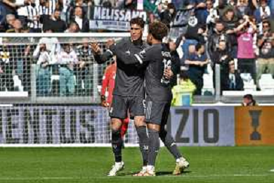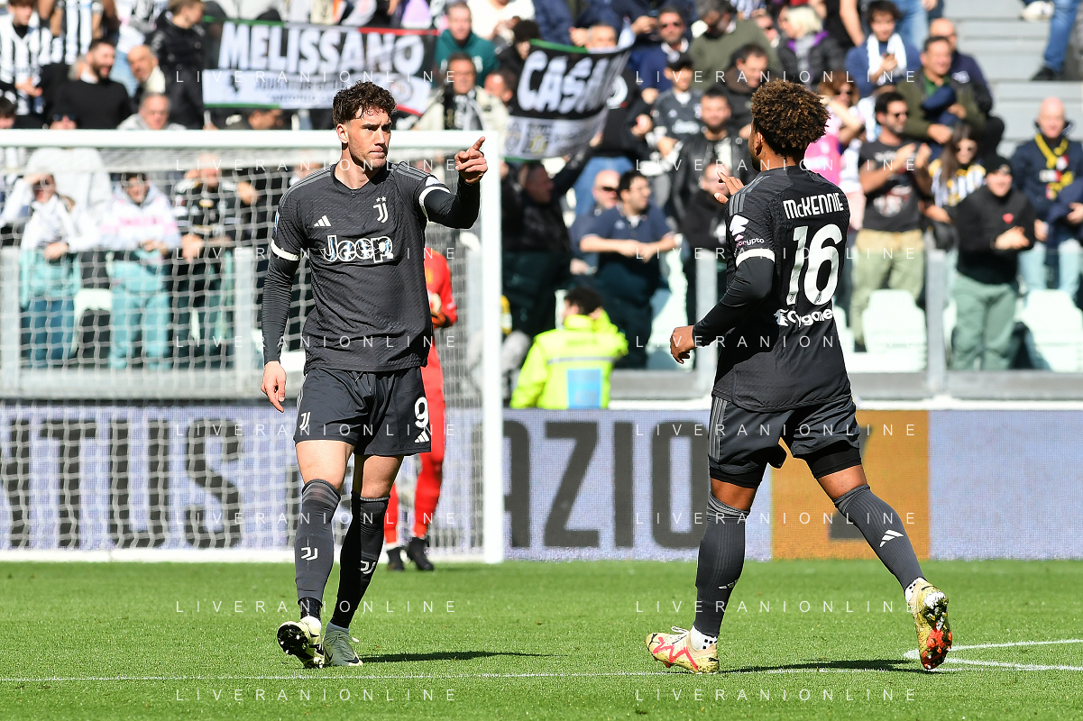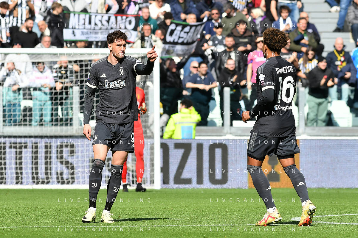 Torino 25.02.2024 Allianz Stadium @Manuela Viganti/Ag. Aldo Liverani sas Juventus vs Frosinone Campionato Calcio Serie A TIM 2023/2024 26a giornata Nella foto: esultanza dusan vlahovic e weston mckennie dopo il gol