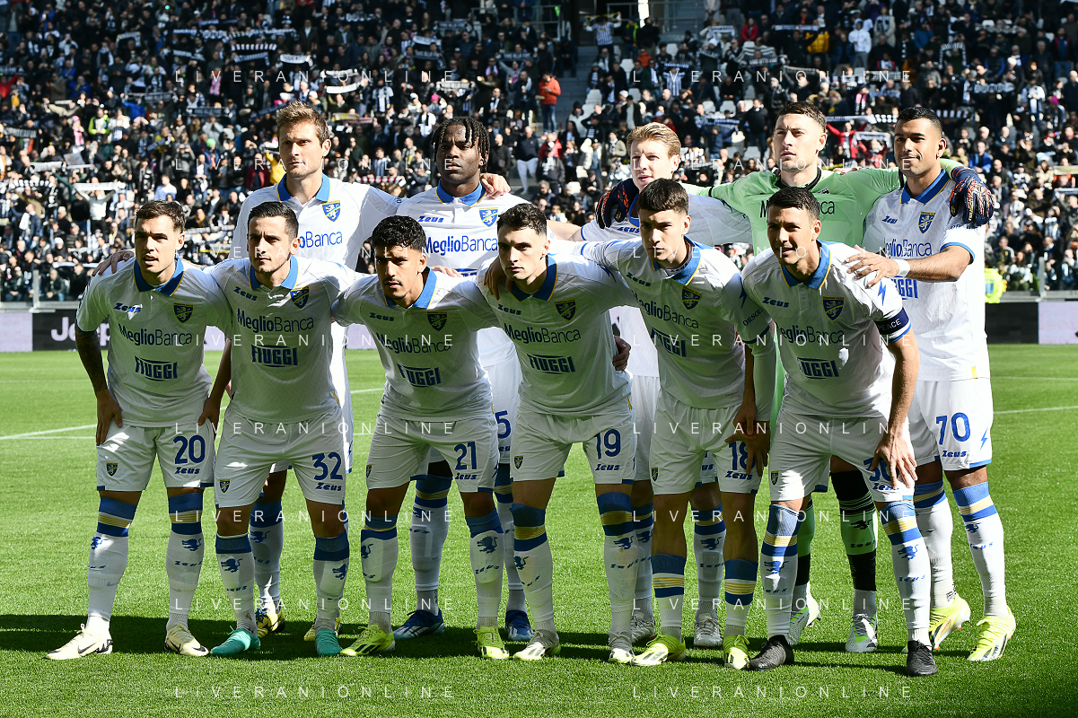 Torino 25.02.2024 Allianz Stadium @Manuela Viganti/Ag. Aldo Liverani sas Juventus vs Frosinone Campionato Calcio Serie A TIM 2023/2024 26a giornata Nella foto: la formazione del frosinone da sx verso dx: simone romagnoli, memeh okoli, marco brescianini, michele cerofolini, waled cheddira, pol lirola, emanuele valeri, abdoulrahmane harroui, nadir zortea, matias soulè, luca mazzitelli
