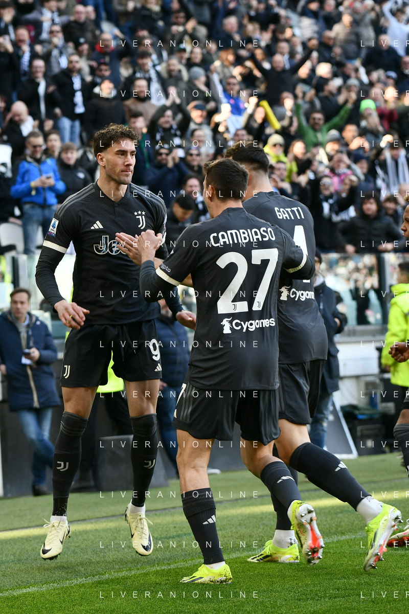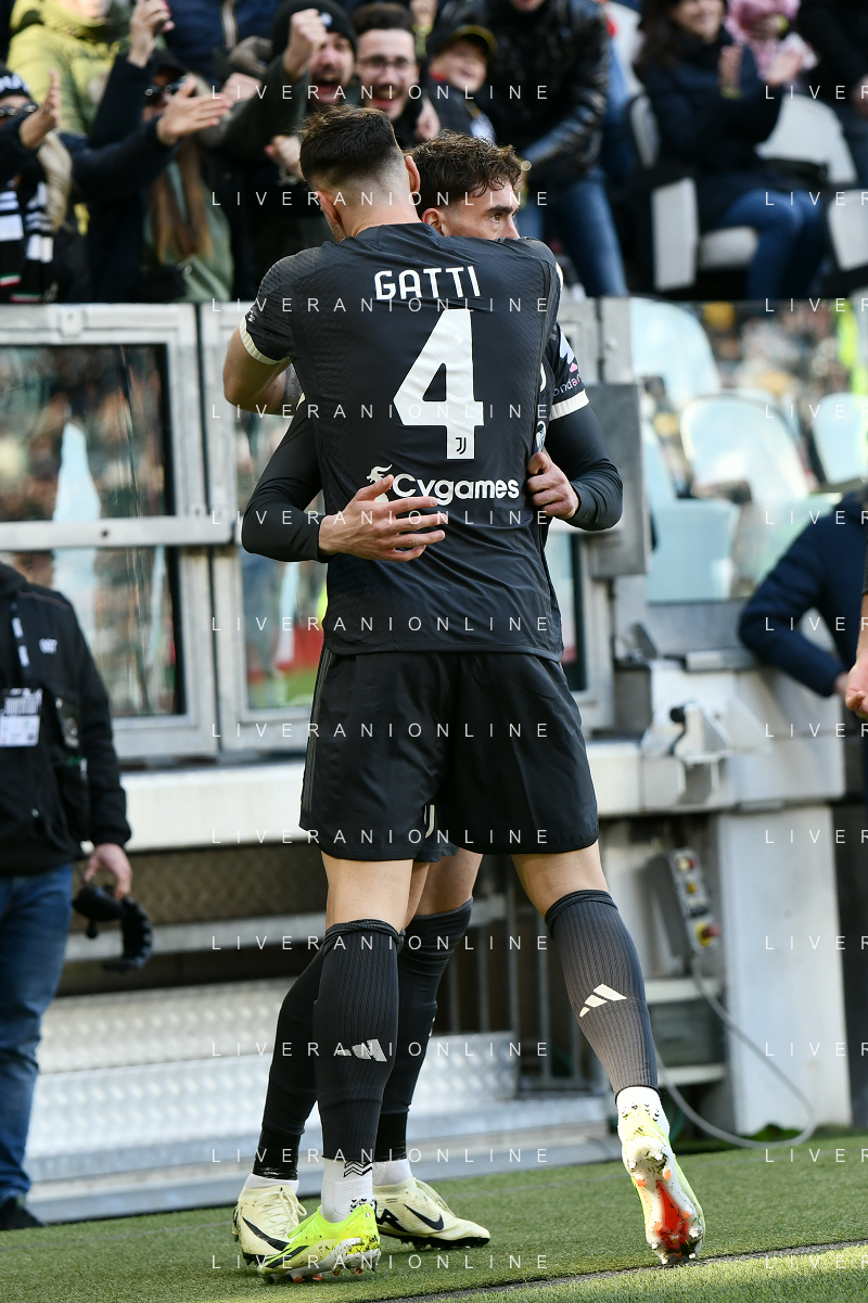 Torino 25.02.2024 Allianz Stadium @Manuela Viganti/Ag. Aldo Liverani sas Juventus vs Frosinone Campionato Calcio Serie A TIM 2023/2024 26a giornata Nella foto: esultanza dusan vlahovic e federico gatti dopo il gol