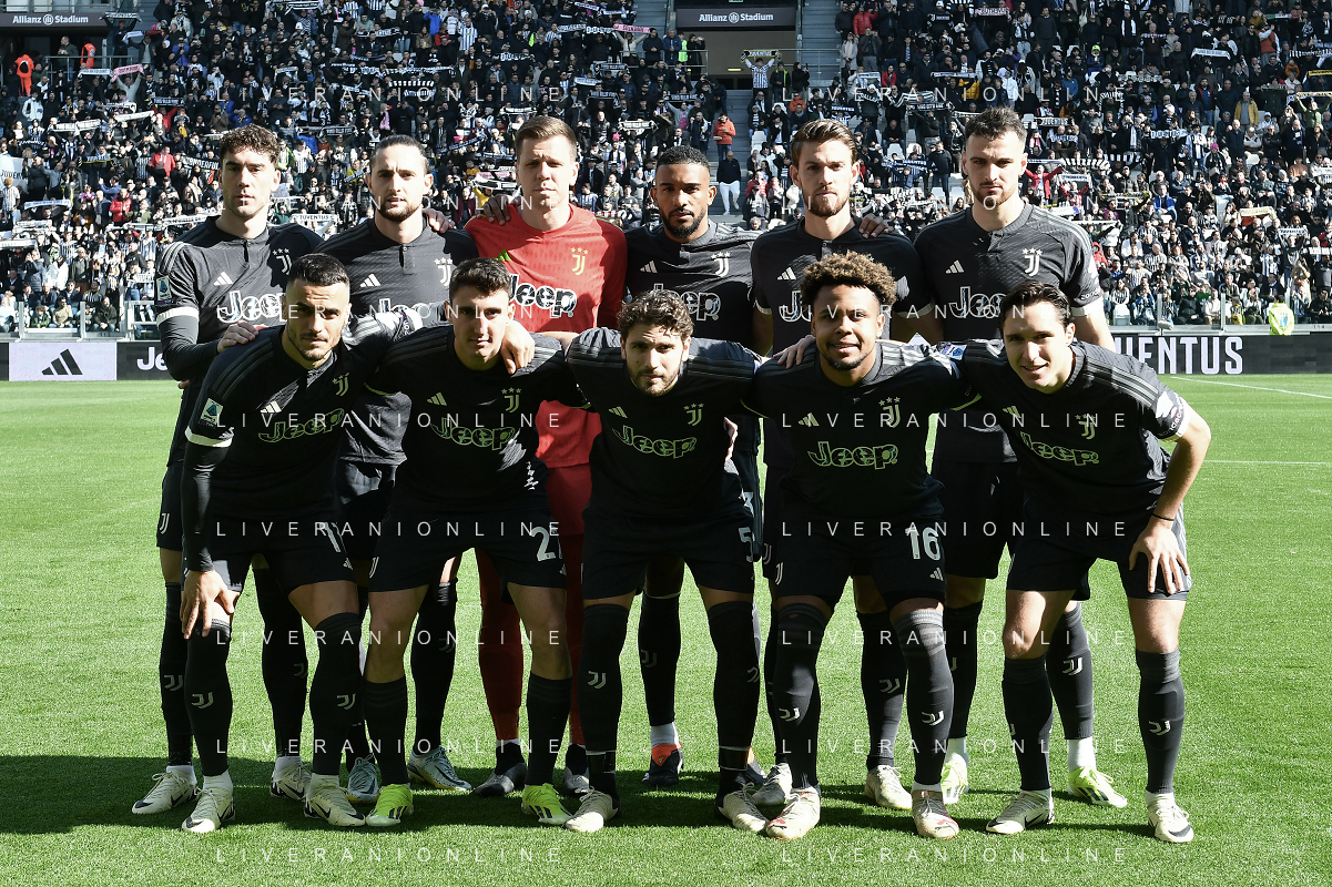 Torino 25.02.2024 Allianz Stadium @Manuela Viganti/Ag. Aldo Liverani sas Juventus vs Frosinone Campionato Calcio Serie A TIM 2023/2024 26a giornata Nella foto: la formazione della juventus da sx verso dx: dusan vlahovic, adrien rabiot, wojciech szczesny, gleison bremer, daniele rugani, federico gatti, filip kostic, andrea cambiaso, manuel locatelli, weston mckennie, federico chiesa