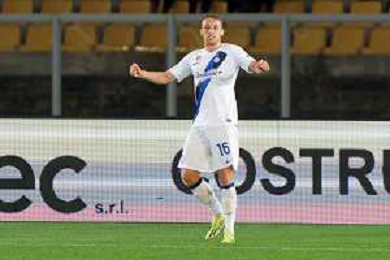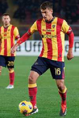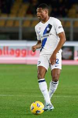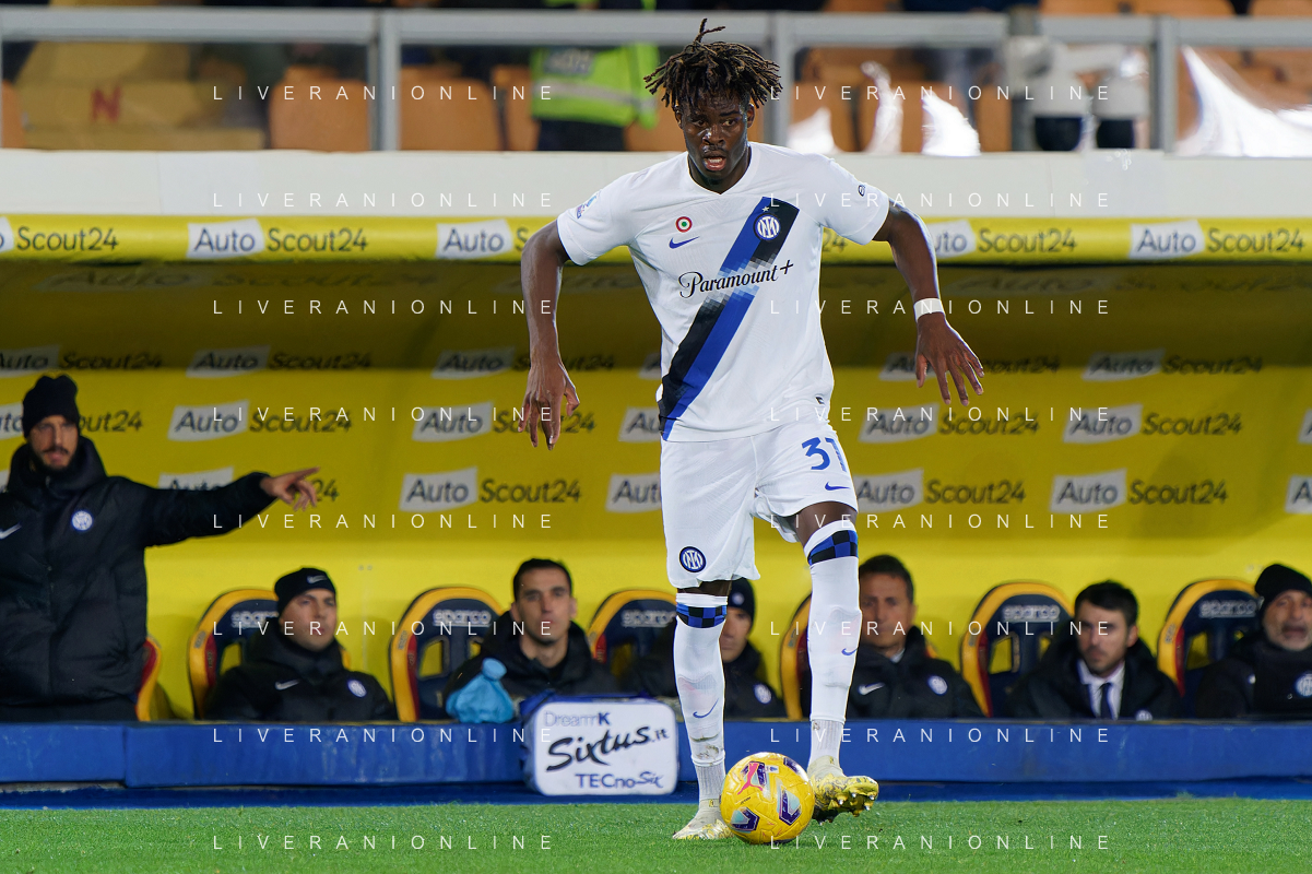 Yann Aurel Bisseck of FC Inter in action against Nicola Sansone of US Lecce
