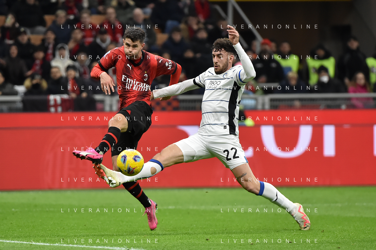Milan vs Atalanta nella foto Christian Mate Pulisic (Milan) e Matteo Ruggeri (Atalanta) Milano 25-02-2024 Stadio Giuseppe Meazza - San Siro Campionato Serie A TIM - 26a giornata foto Roberto Garavaglia/Agenzia Aldo Liverani sas/AGENZIA ALDO LIVERANI SAS