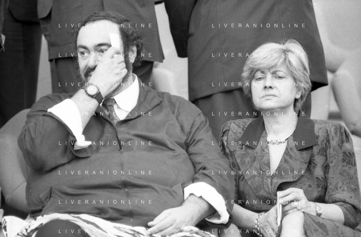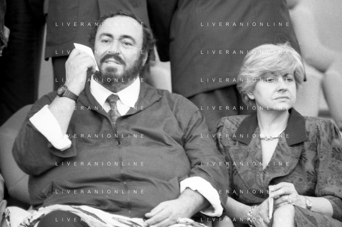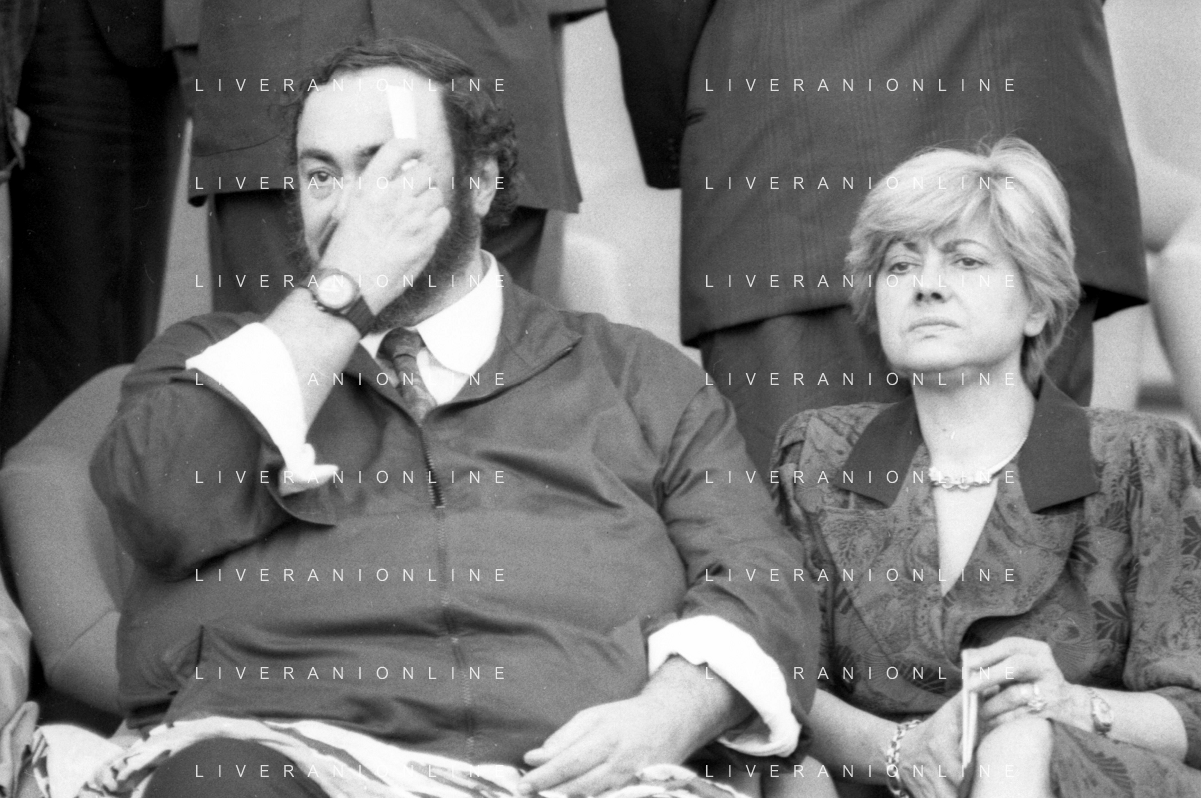 Neg - RETROSPETTIVA LUCIANO PAVAROTTI TENORE NELLA FOTO CON LA PRIMA MOGLIE ADUA VERONI IN TRIBUNA DURANTE I MONDIALI DI CALCIO 'ITALIA '90' NELL'ANNO 1990 AG ALDO LIVERANI SAS