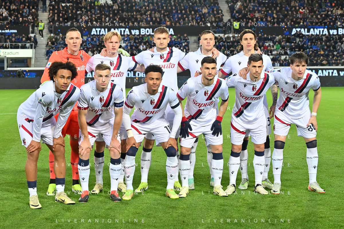 TVRG Atalanta vs Bologna nella foto formazione Bologna, in piedi da SX Lukasz Skorupski, Victor Kristiansen, Stefan Posch, Mattias Svanberg e Riccardo Calafiori; in basso da SX Joshua Zirkzee, Lewis Ferguson, Dan Ndoye, Riccardo Orsolini, Remo Freuler e Giovanni Fabbian Bergamo 03-03-2024 Gewiss Stadium Campionato Serie A TIM - 27a giornata foto Roberto Garavaglia/Agenzia Aldo Liverani sas