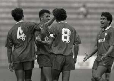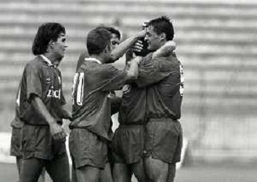 NEG-16-09-1990 MONZA -CAMPIONATO DI CALCIO SERIE C1 MONZA-BARACCA LUGO 1-0 NELLA FOTO ABBRACCI DOPO GOAL ANSELMO ROBBIATI AG ALDO LIVERANI SAS