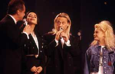 DIAP-RETRSPETTIVA NIKKA COSTA CANTANTE NELLA FOTO NIKKA COSTA CON AMEDEO MINGHI E MIETTA A SANREMO NELL'ANNO 1990 AG ALDO LIVERANI SAS