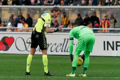 TVEM the referee Daniele Chiffi of Padova and Lorenzo Montipò of Hellas Verona during the Italian soccer Serie A match Lecce vs Hellas Verona on March 10, 2024 at Via del Mare Stadium in Lecce, Italy. Photo Emmanuele Mastrodonato/agenzia Liverani/AGENZIA ALDO LIVERANI SAS