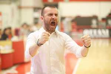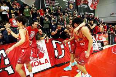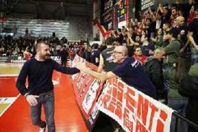 CENTO(FERRARA) 10 03 2024 ANDREA COSTA BASKET-VIRTUS LUMEZZANE SERIE B 89-80 NELLA FOTO EMANUELE DI PAOLANTONIO ALLENATORE IMOLA CON I TIFOSI ©SANNA/AGENZIA ALDO LIVERANI SAS