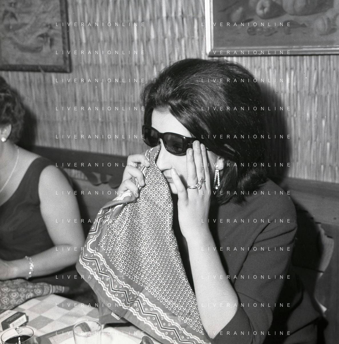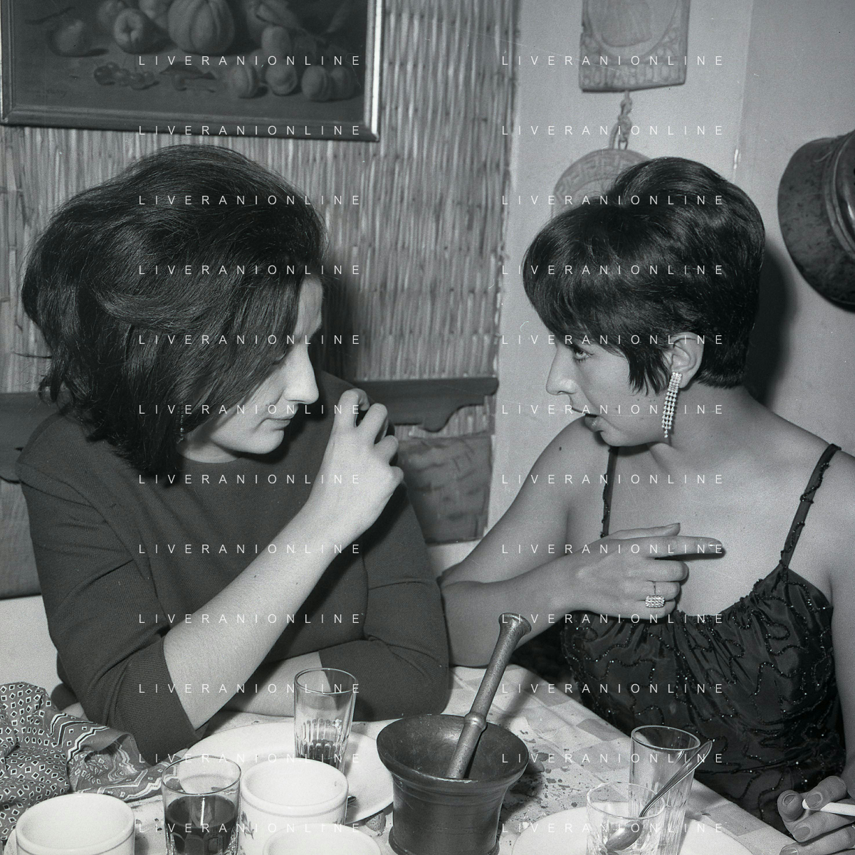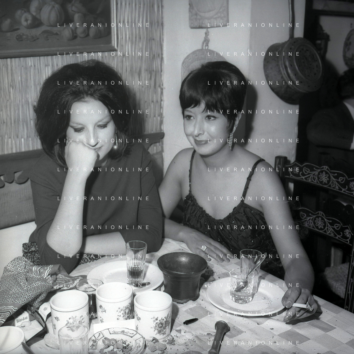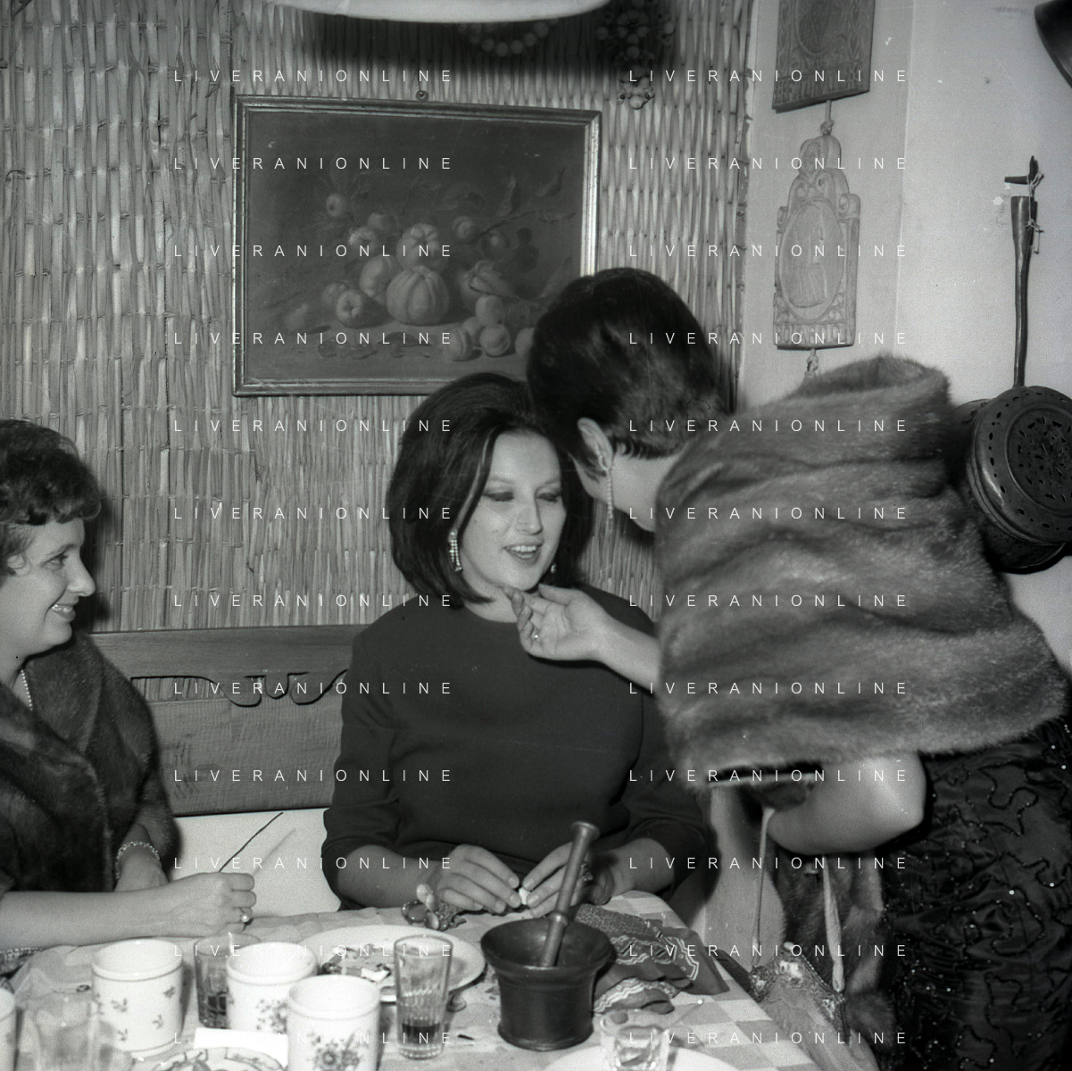 NEG-01-10-1963 MILANO RETROSPETTIVA MINA MAZZINI CANTANTE NELLA FOTO MINA MAZZINI CON MARISA DEL FRATE E CORRADO PANI A MILANO IN UN RISTORANTE AG ALDO LIVERANI SAS
