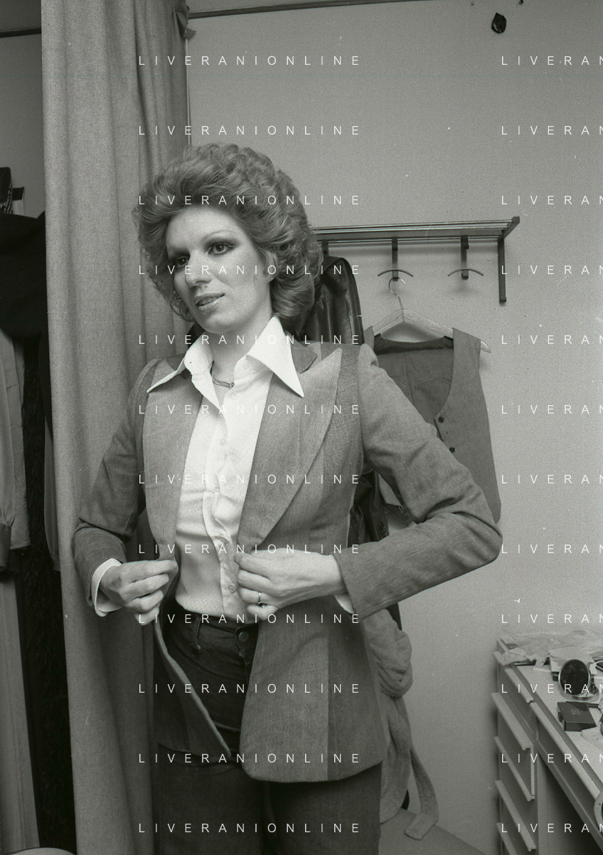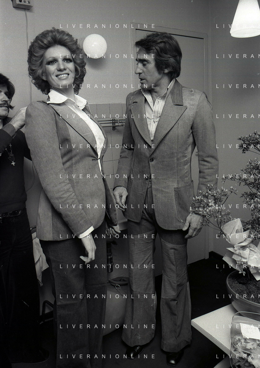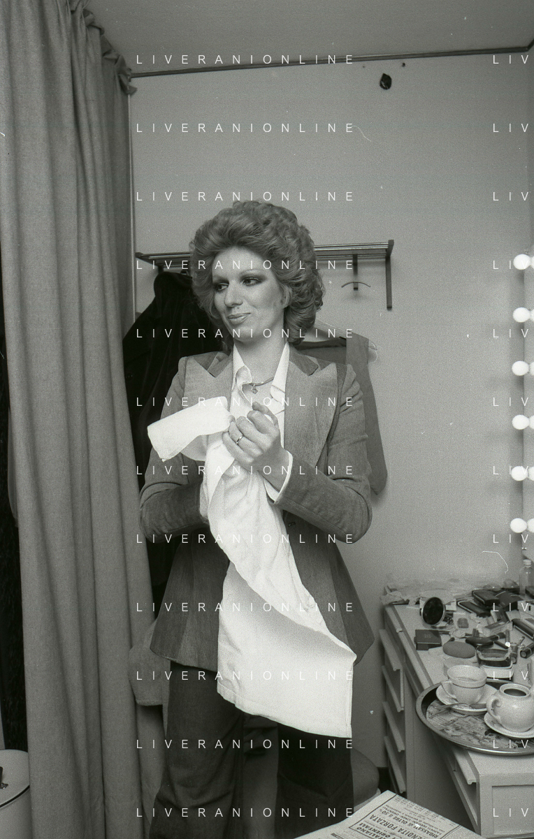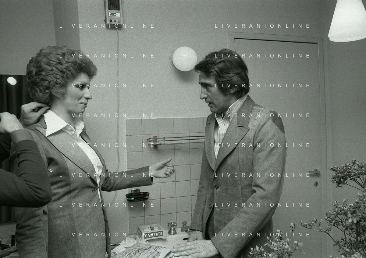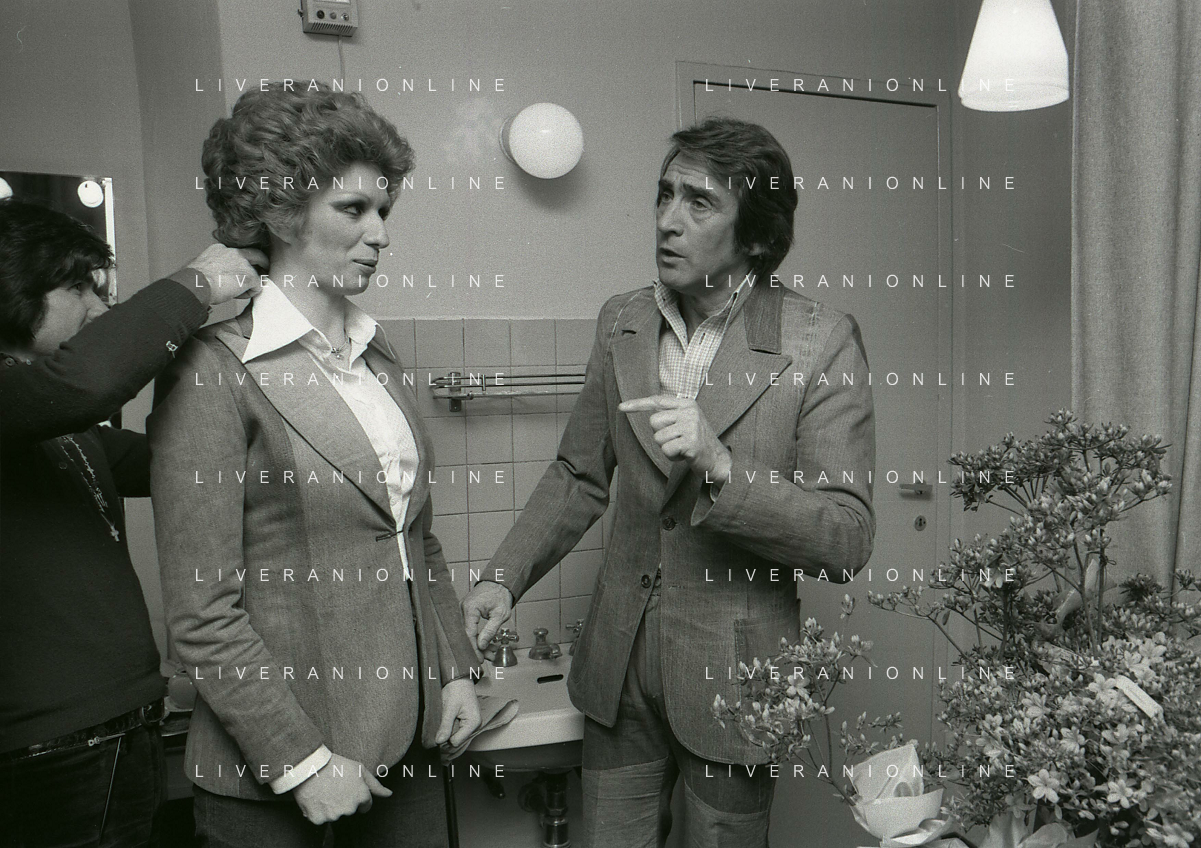 NEG-RETROSPETTIVA IVA ZANICCHI CANTANTE NELLA FOTO IVA ZANICCHI NELL'ANNO 1974 A MILANO NELLA COMMEDIA“ TRA DI NOI“ NEI CAMERINI CON TONY RENIS E IL PARRUCCHIERRE ROLANDO ELISEI AG ALDO LIVERANI SAS