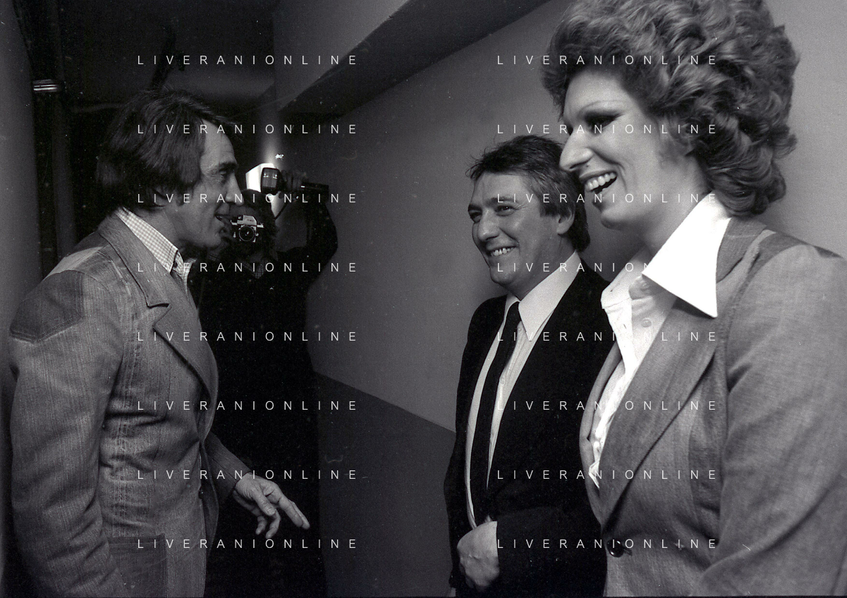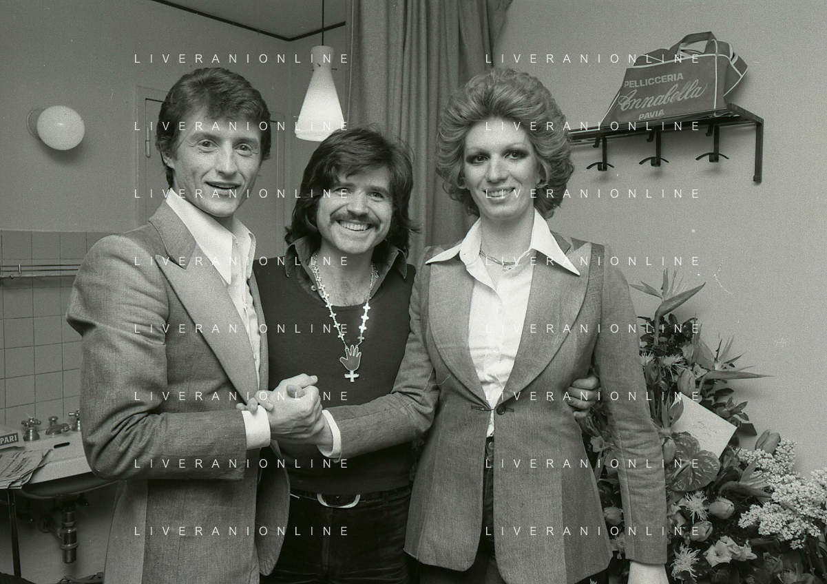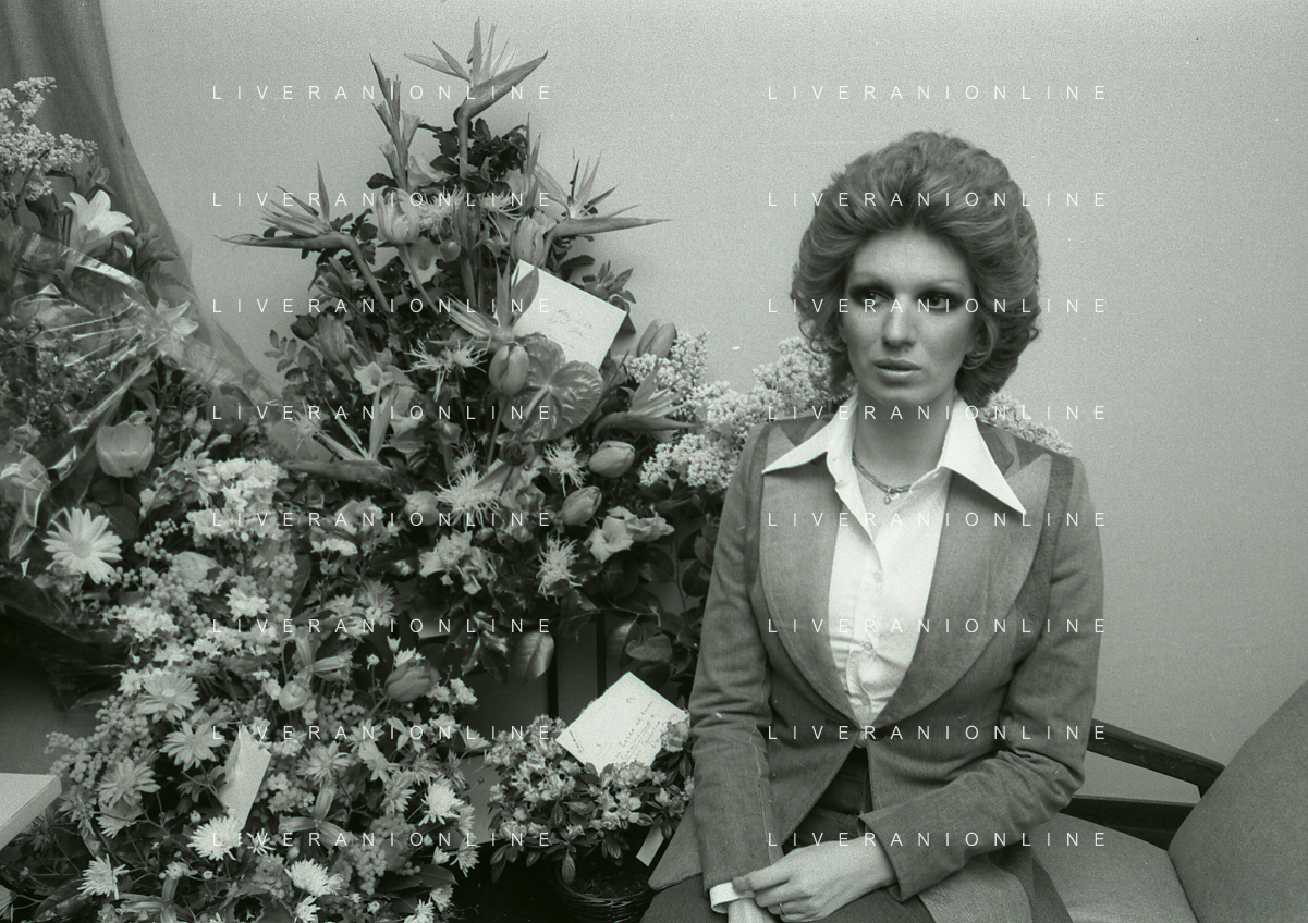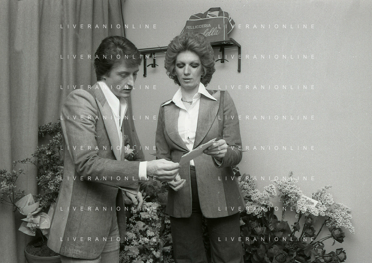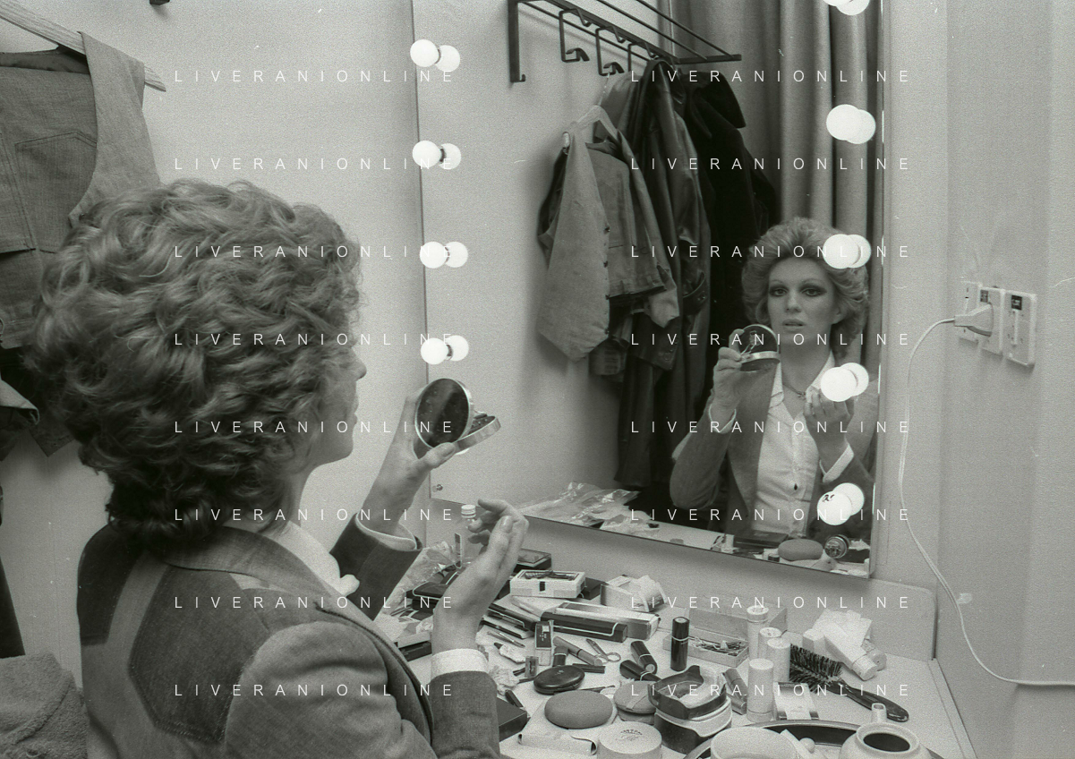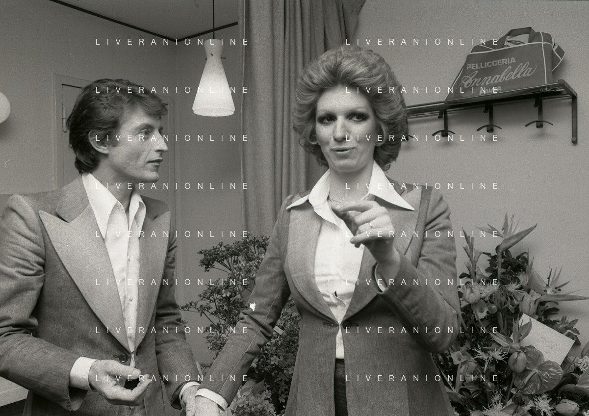 NEG-RETROSPETTIVA IVA ZANICCHI CANTANTE NELLA FOTO IVA ZANICCHI NELL'ANNO 1974 A MILANO NELLA COMMEDIA“ TRA DI NOI“ NEI CAMERINI CON TONY RENIS E IL PARRUCCHIERRE ROLANDO ELISEI AG ALDO LIVERANI SAS