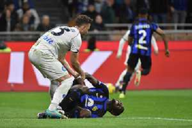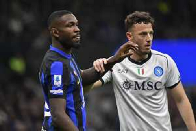 Inter vs Napoli nella foto Amir Rrahmani (Napoli) invita Marcus Thuram (Inter) a rialzarsi dopo il contatto in area giudicato regolare dall'arbitro Federico La Penna di Roma e VAR Milano 17-03-2024 Stadio Giuseppe Meazza - San Siro Campionato Serie A TIM - 29a giornata foto Roberto Garavaglia/Agenzia Aldo Liverani sas/ AGENZIA ALDO LIVERANI SAS