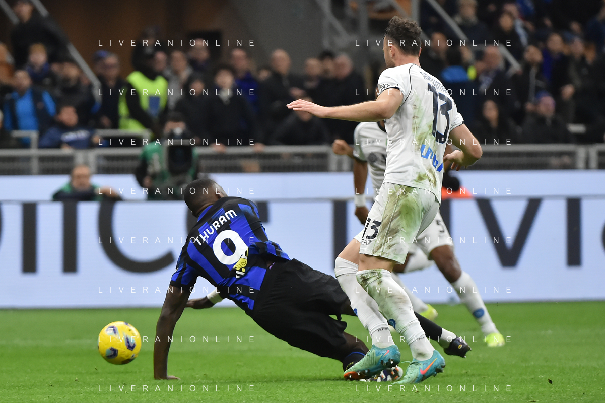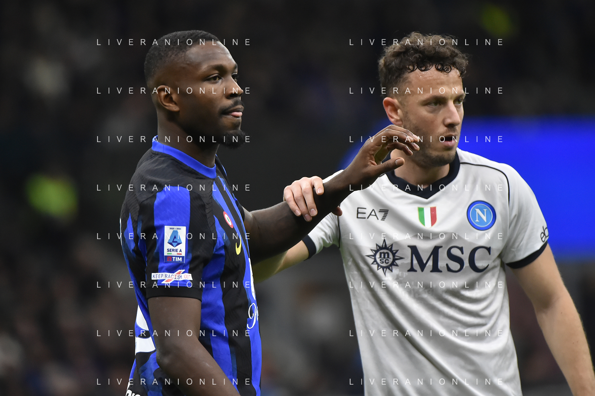 Inter vs Napoli nella foto il contatto in area tra Marcus Thuram (Inter) e Amir Rrahmani (Napoli) giudicato regolare dall'arbitro Federico La Penna di Roma e VAR Milano 17-03-2024 Stadio Giuseppe Meazza - San Siro Campionato Serie A TIM - 29a giornata foto Roberto Garavaglia/Agenzia Aldo Liverani sas/ AGENZIA ALDO LIVERANI SAS