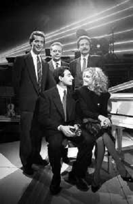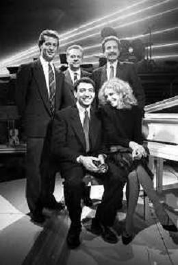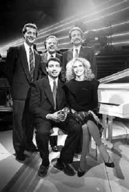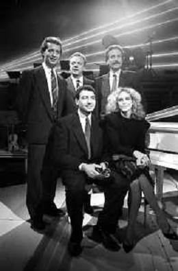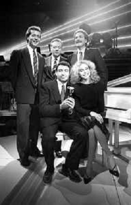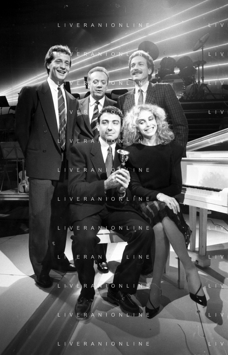 Neg- RETROSPETTIVA JOHNNY DORELLI CANTANTE E CONDUTTORE TV NELLA FOTO CON MICHELE ALBORETO, RENATO ZACCARELLI, GIUSEPPE DOSSENA E SIDNEY ROME NELLA TRASMISSIONE TELEVISIVA “PREMIATISSIMA“ NELL'ANNO 1985-1986 A MILANO AG ALDO LIVERANI SAS