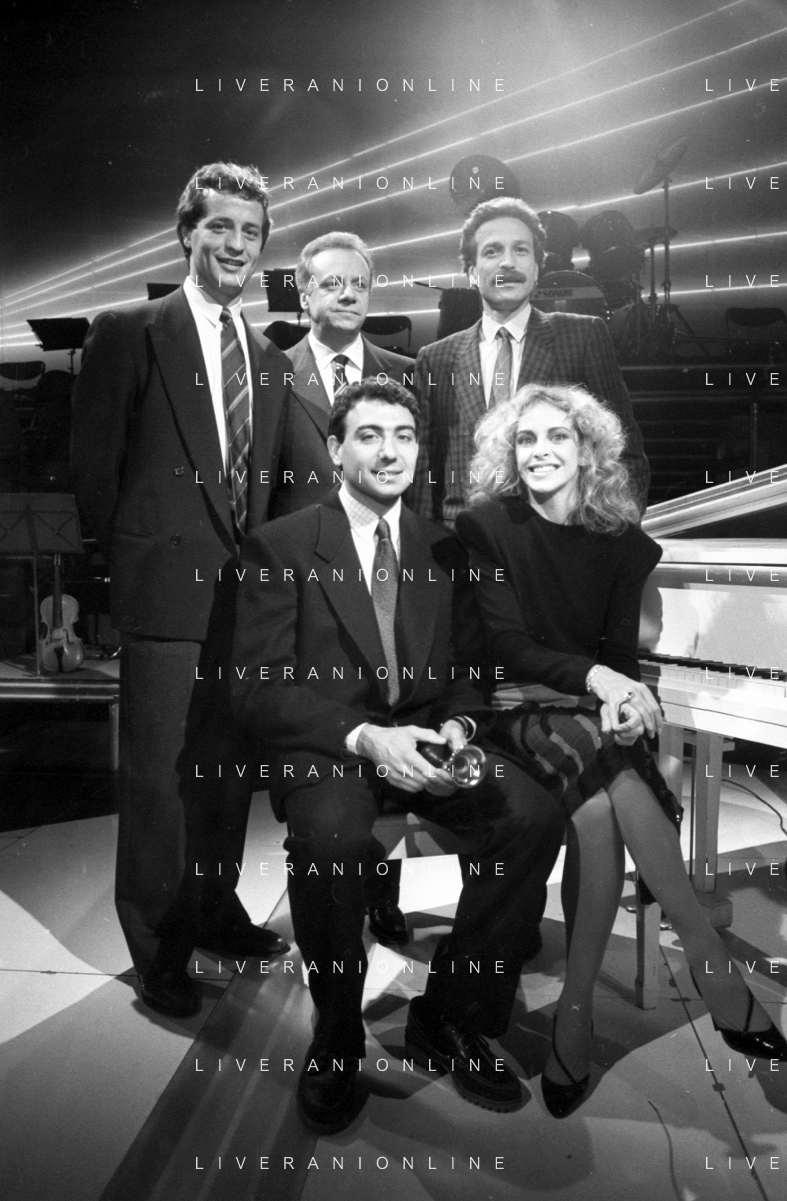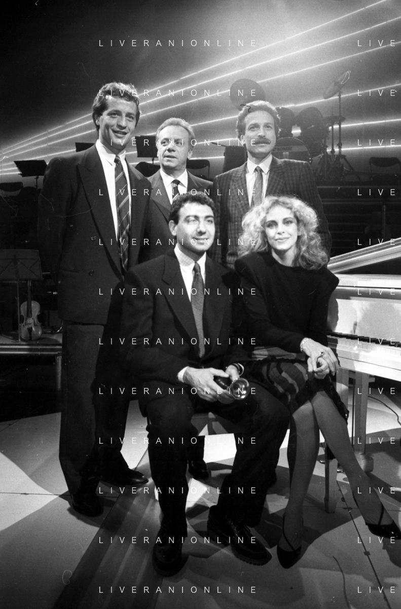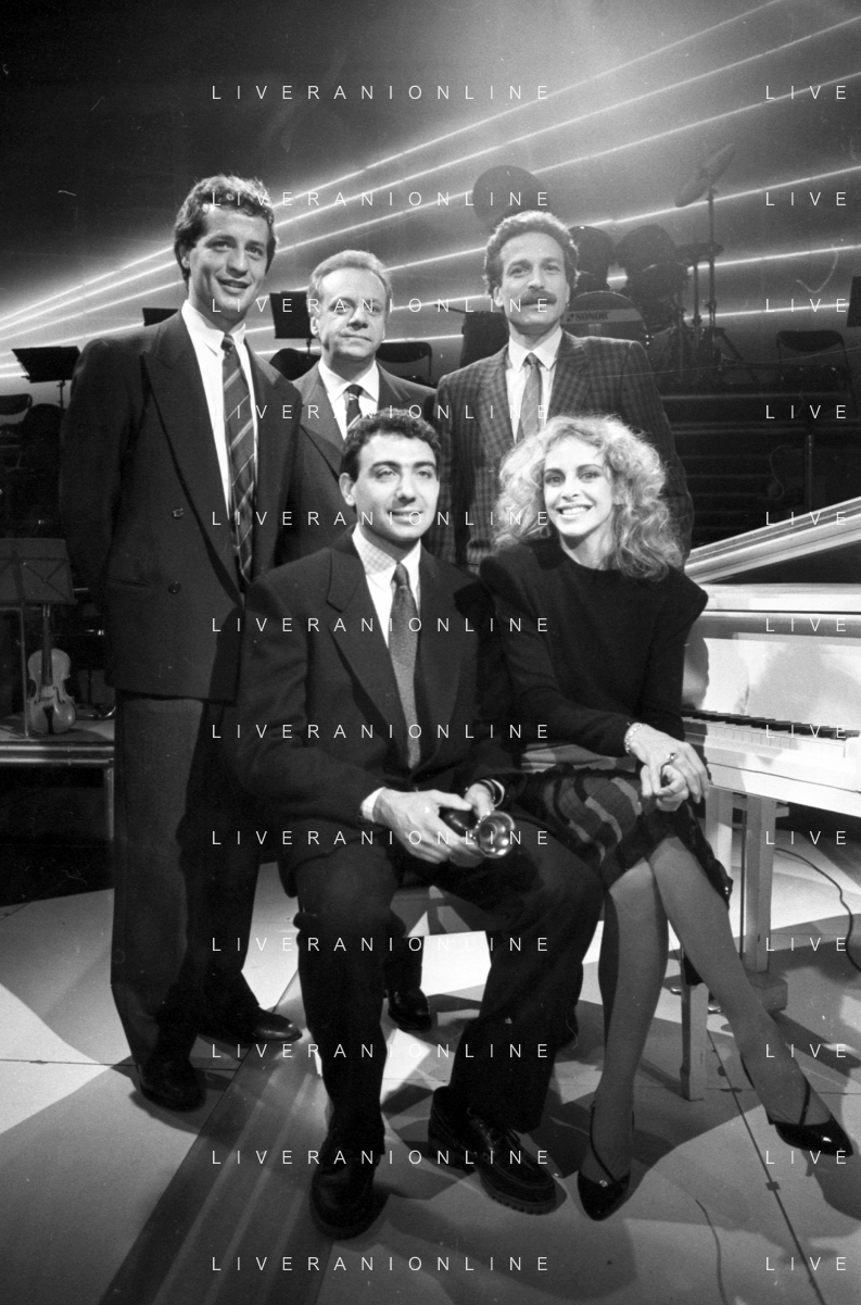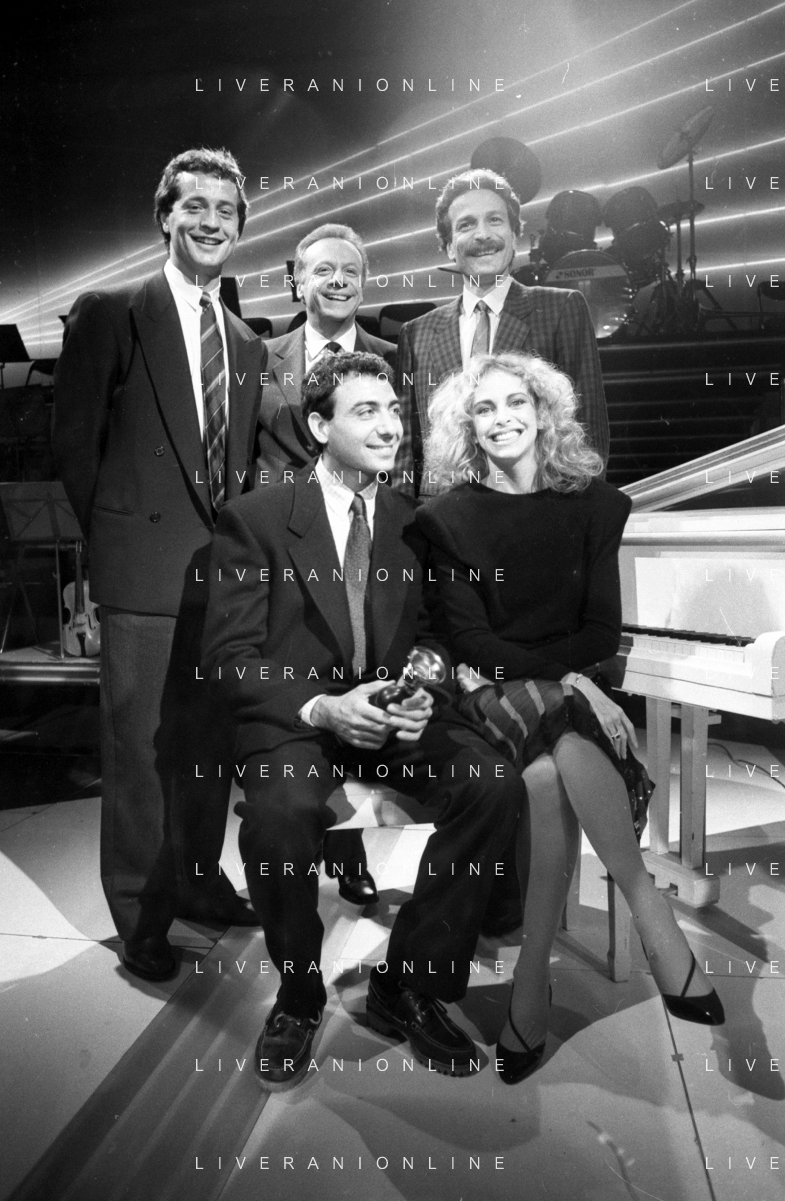 Neg- RETROSPETTIVA JOHNNY DORELLI CANTANTE E CONDUTTORE TV NELLA FOTO CON MICHELE ALBORETO, RENATO ZACCARELLI, GIUSEPPE DOSSENA E SIDNEY ROME NELLA TRASMISSIONE TELEVISIVA “PREMIATISSIMA“ NELL'ANNO 1985-1986 A MILANO ?AG ALDO LIVERANI SAS
