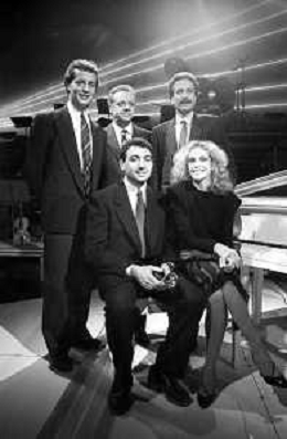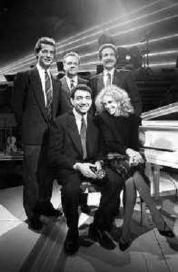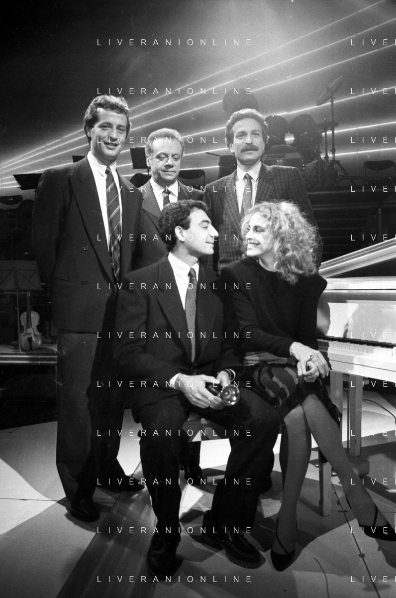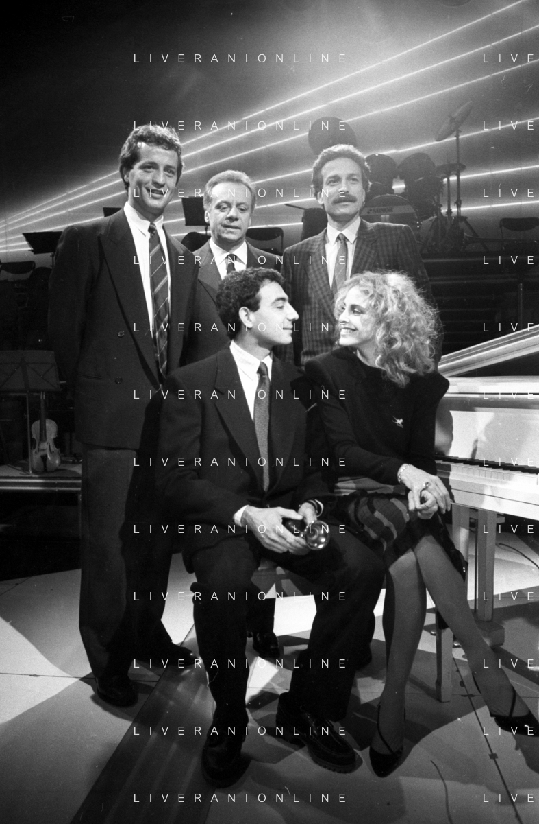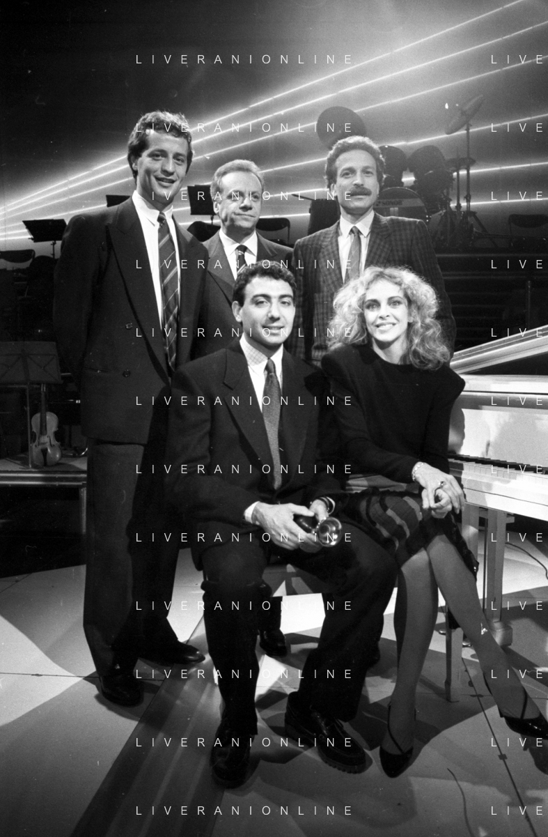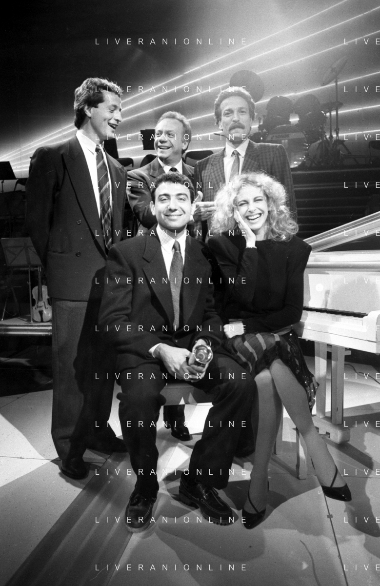 Neg- RETROSPETTIVA JOHNNY DORELLI CANTANTE E CONDUTTORE TV NELLA FOTO CON MICHELE ALBORETO, RENATO ZACCARELLI, GIUSEPPE DOSSENA E SIDNEY ROME NELLA TRASMISSIONE TELEVISIVA “PREMIATISSIMA“ NELL'ANNO 1985-1986 A MILANO ?AG ALDO LIVERANI SAS