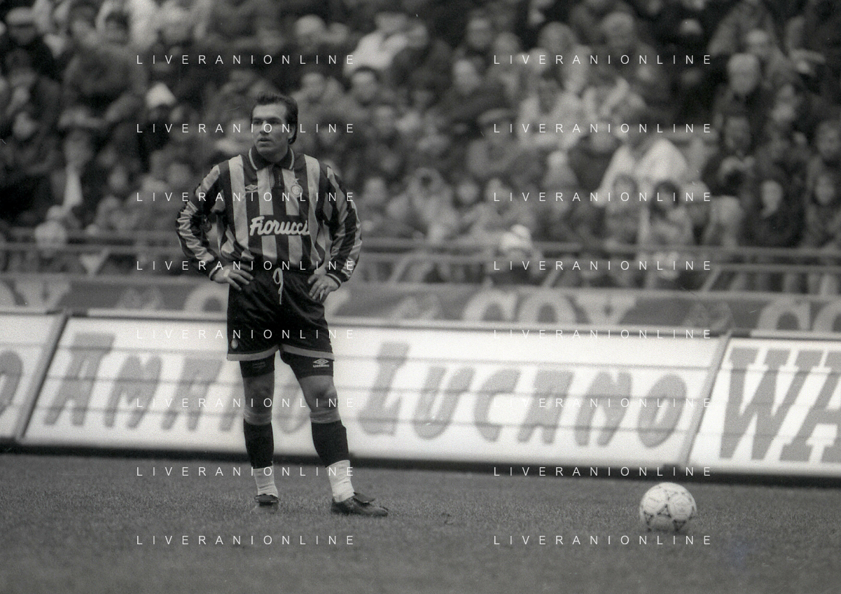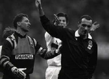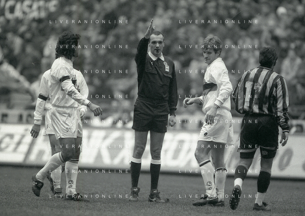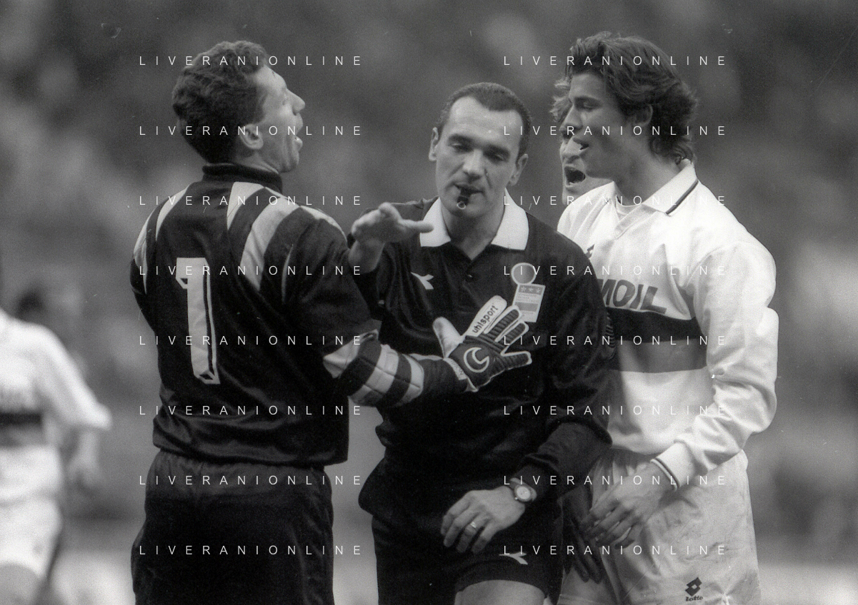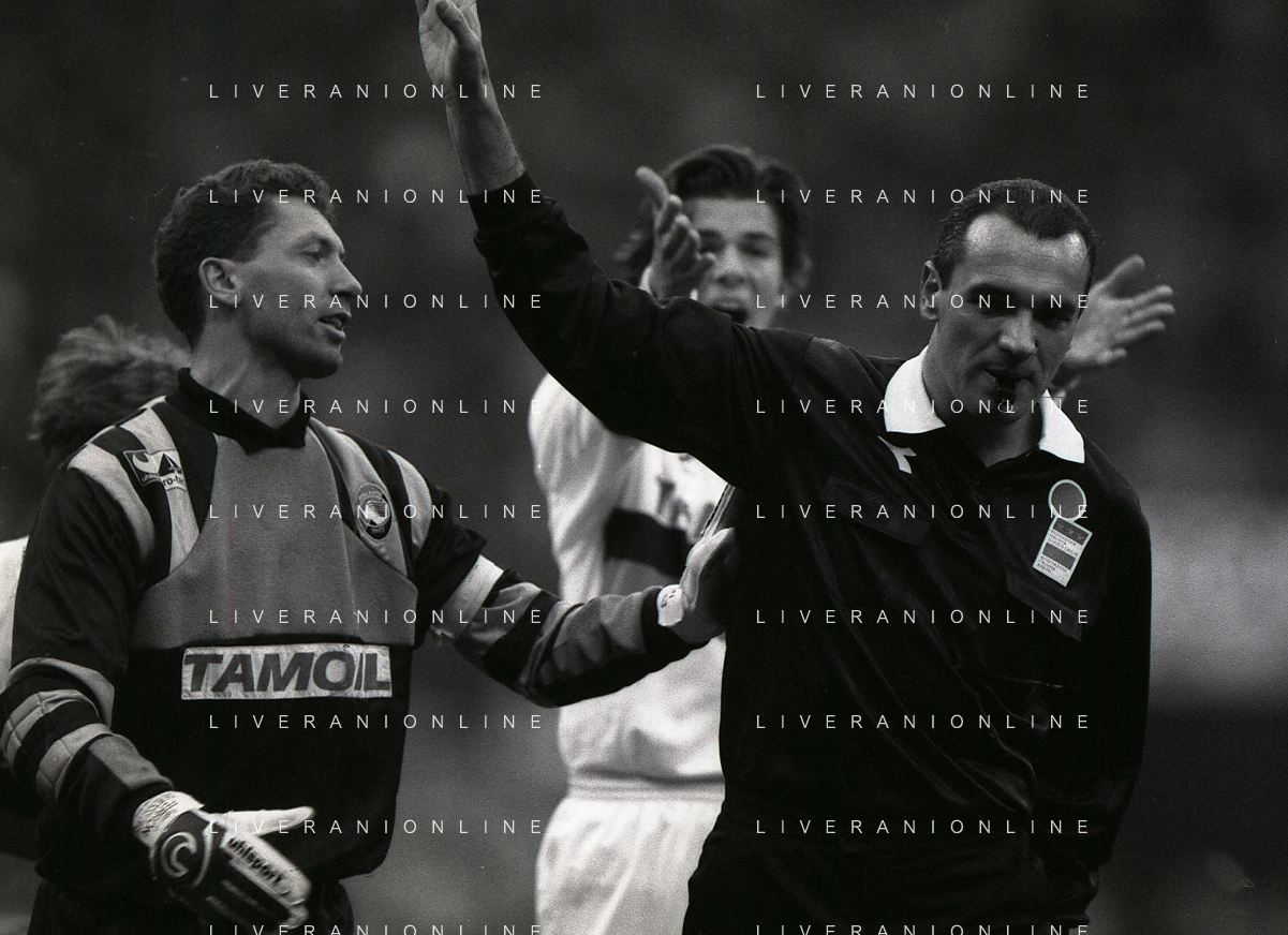NEG-02-01-1994 MILANO CAMPIONATO DI CALCIO SERIE A INTER-ATALANTA 1-2 NELLA FOTO FABRIZIO FERRON CON L'ARBITRO GIANNI BESCHIN E SIMONE PAVAN AG ALDO LIVERANI SAS
