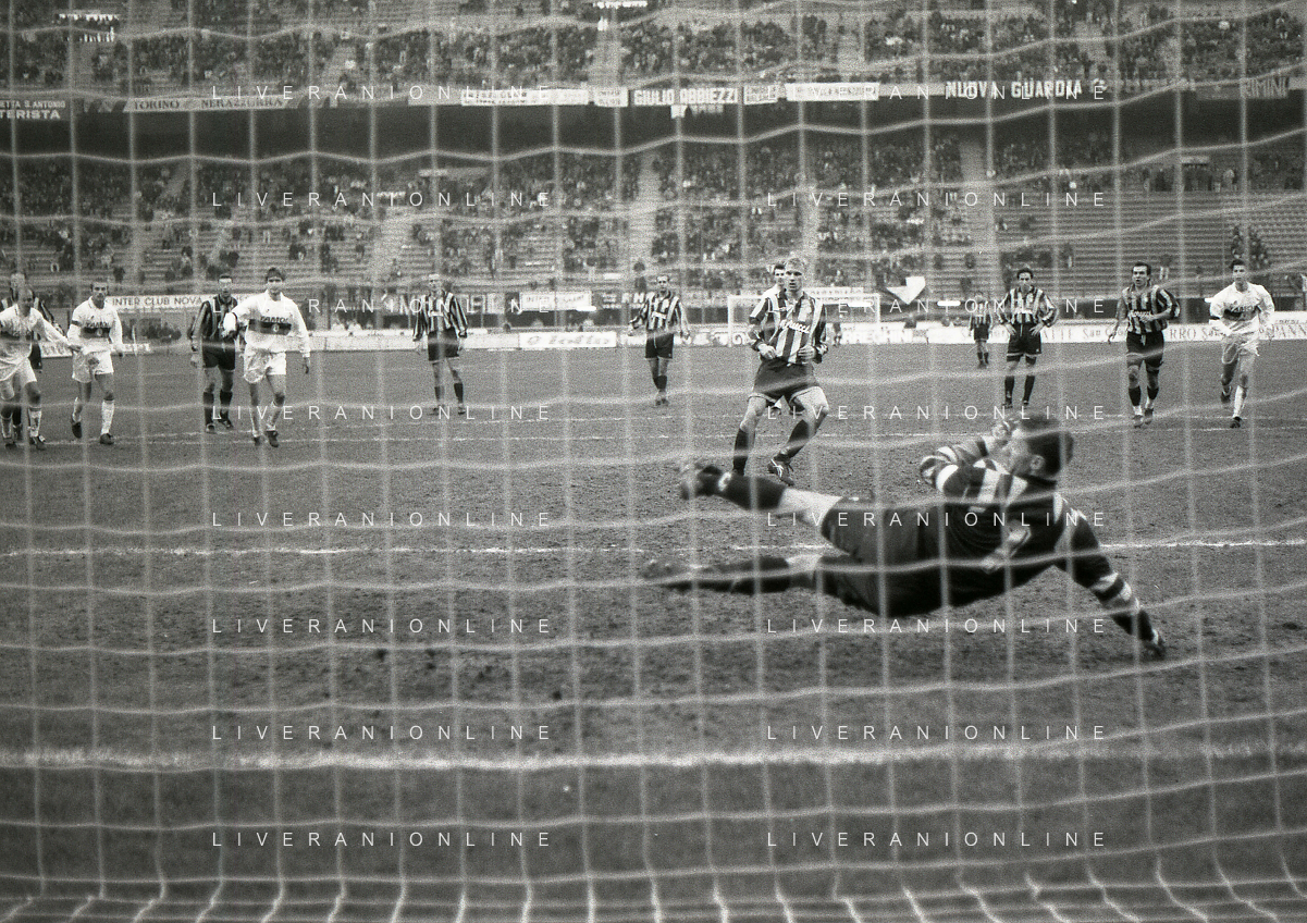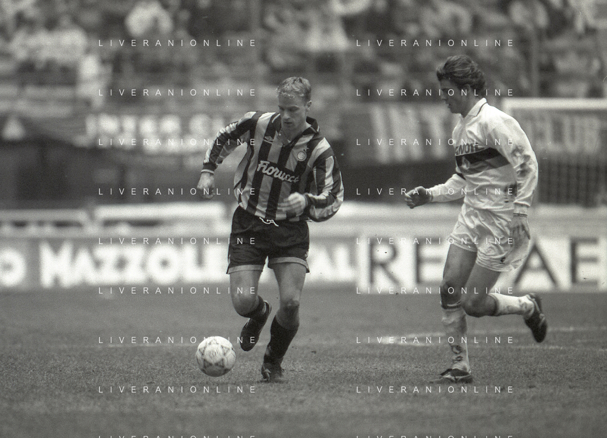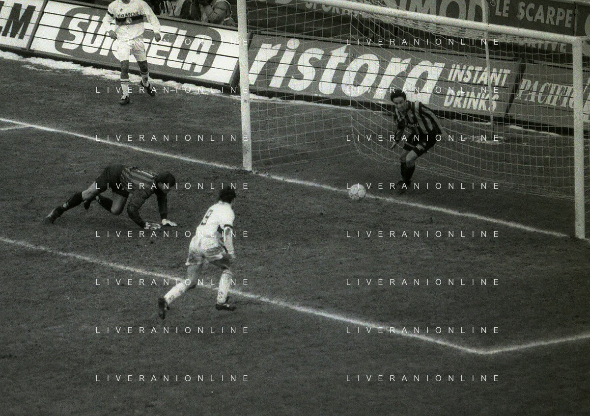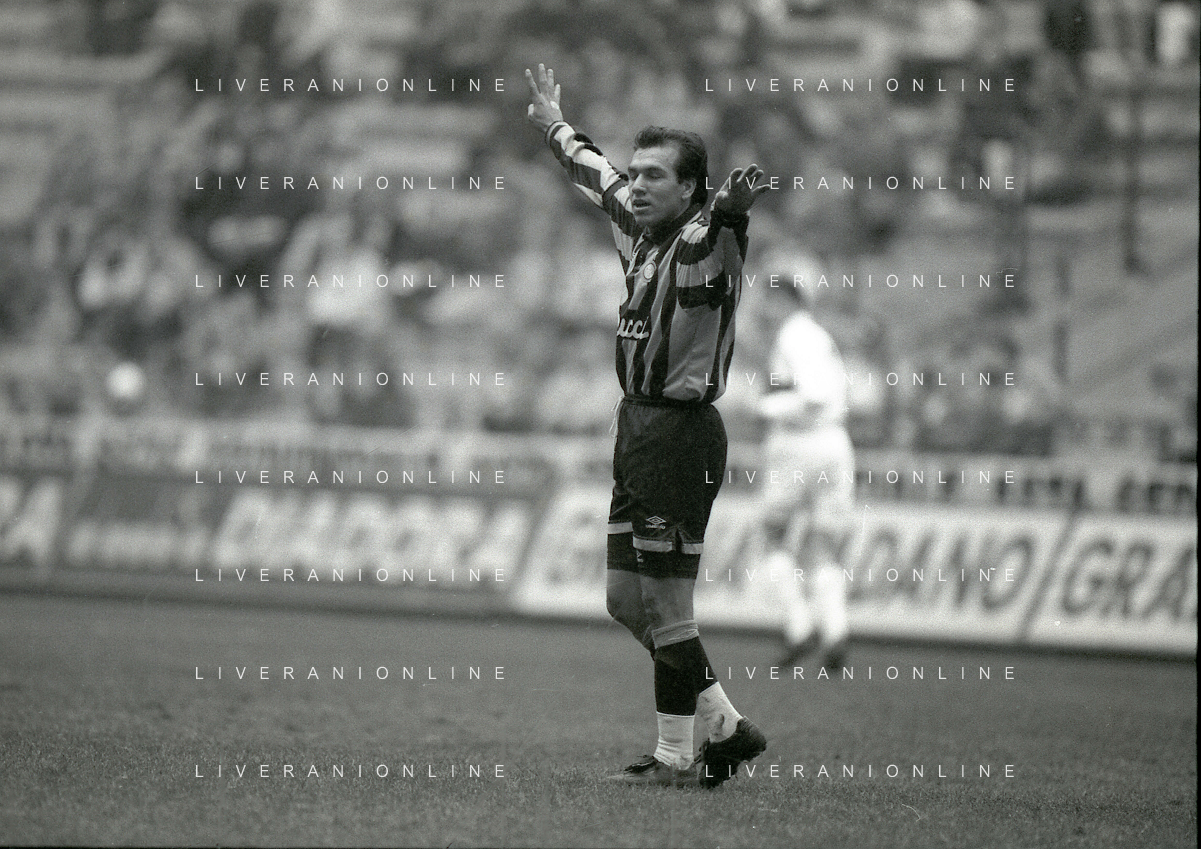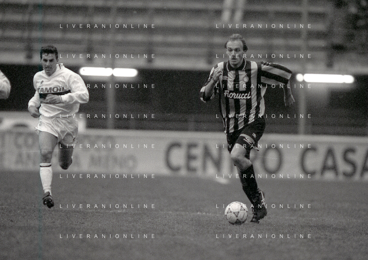 NEG-02-01-1994 MILANO CAMPIONATO DI CALCIO SERIE A INTER-ATALANTA 1-2 NELLA FOTO GIUSEPPE BERGOMI-ANTONIO MANICONE E SERGIO BATTISTINI AG ALDO LIVERANI SAS