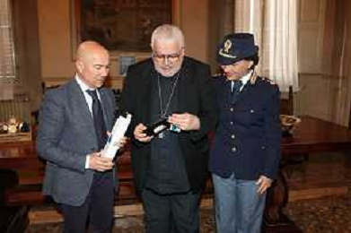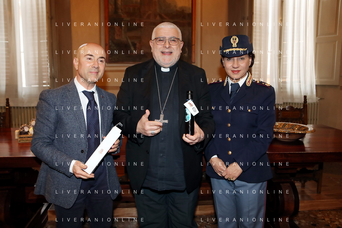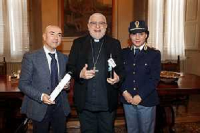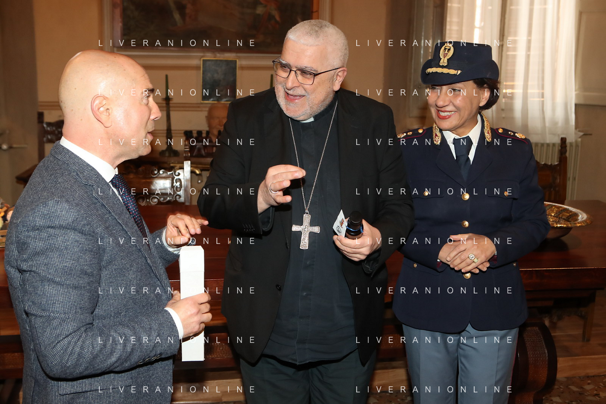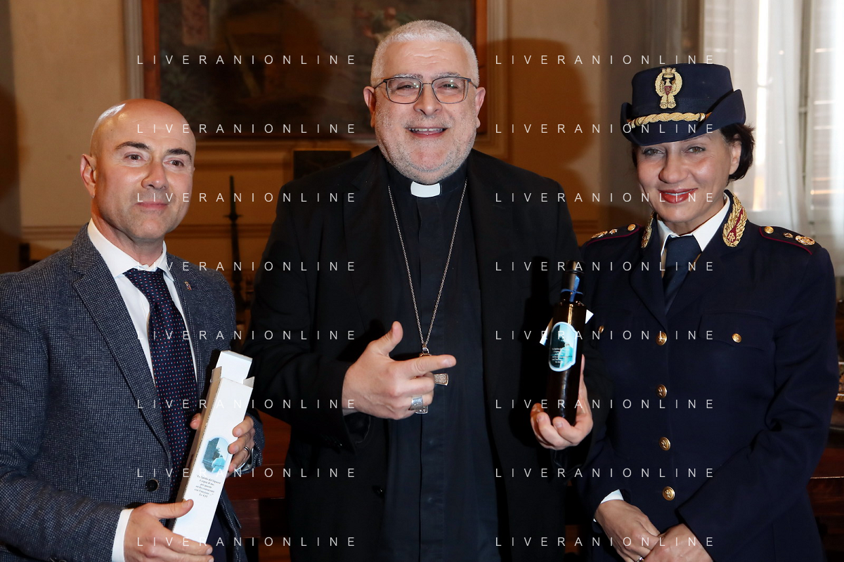 IMOLA 28 03 2024 LA POLIZIA DI STATO DONA L'OLIO DI CAPACI PER LA MESSA CRESIMALE NELLA FOTO PRIMO DIRIGENTE DELLA POLIZIA DI STATO DI IMOLA LUCIANO DI PRISCO,VESCOVO DI IMOLA GIOVANNI MOSCIATTI E ANGELA PICCIRILLO POLIZIA DI STATO FOTO GIANNI SANNA-AG ALDO LIVERANI SAS
