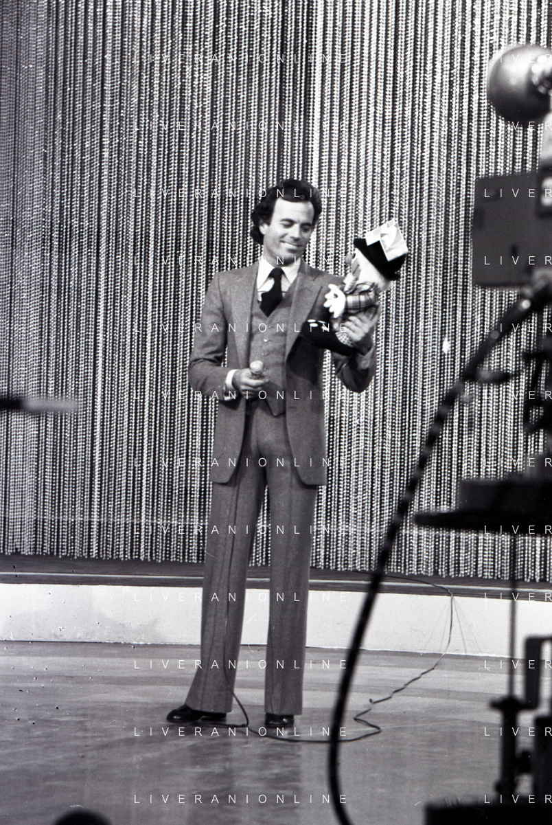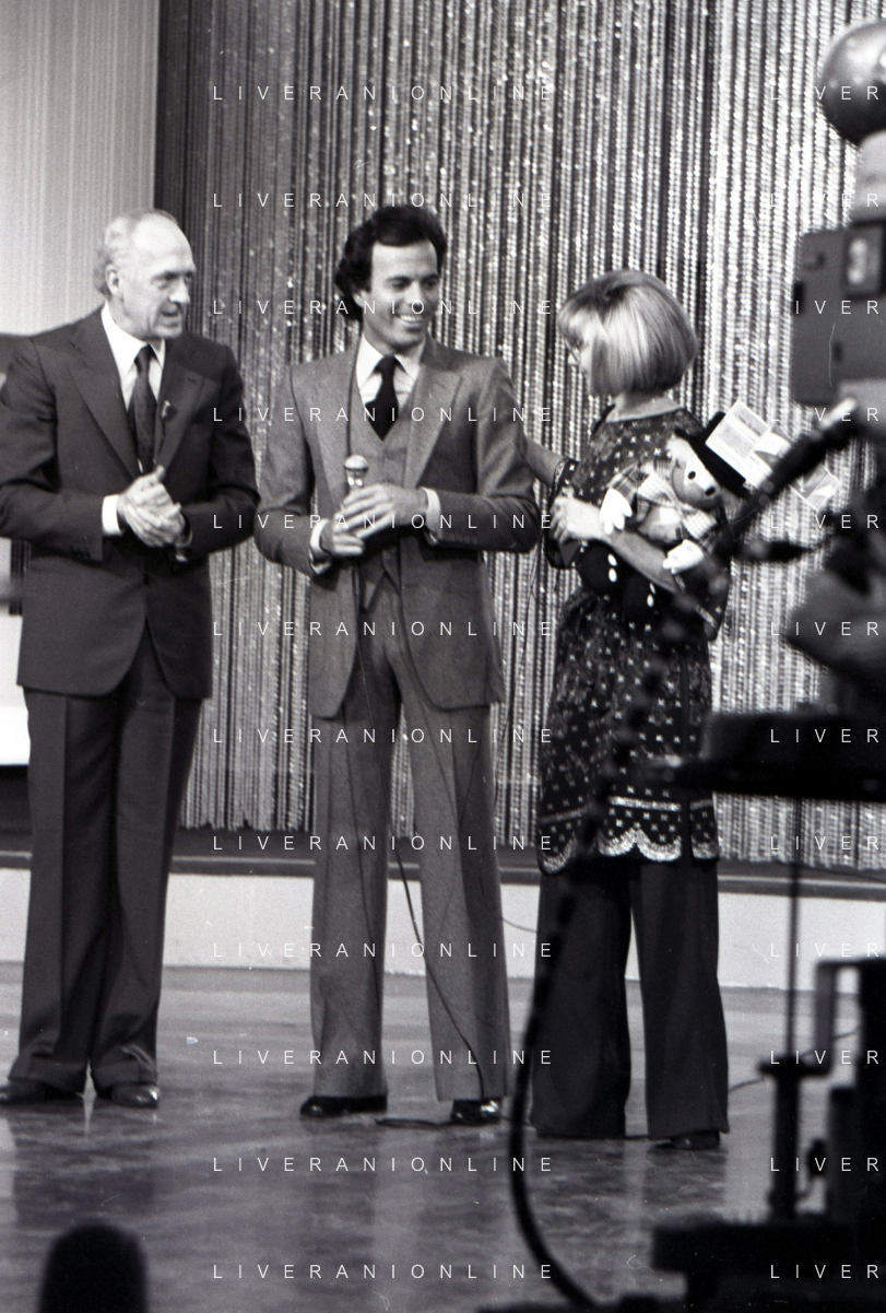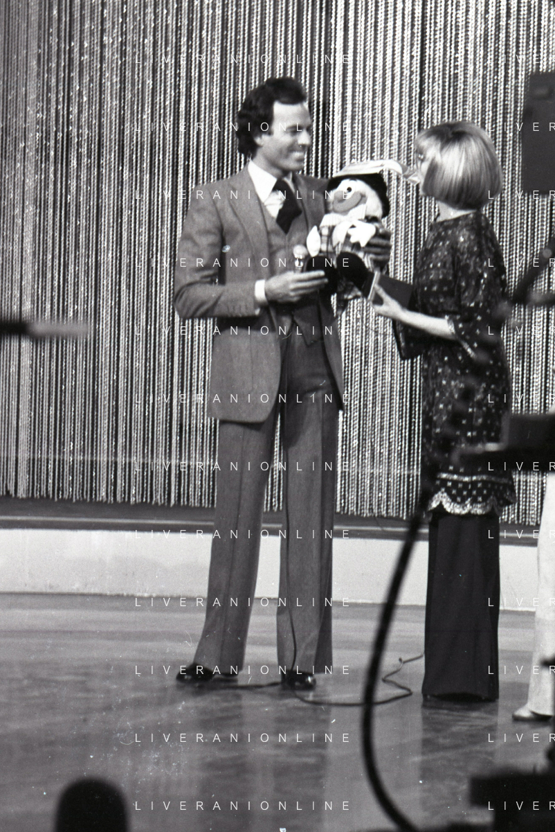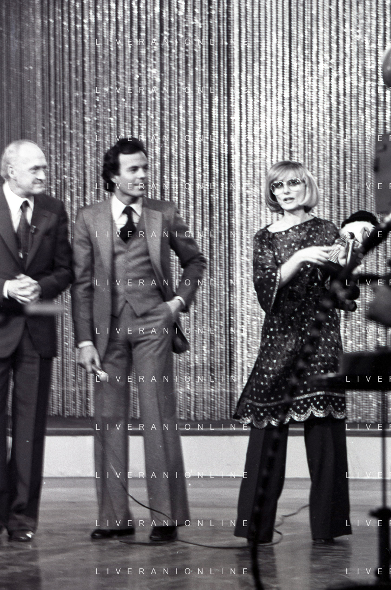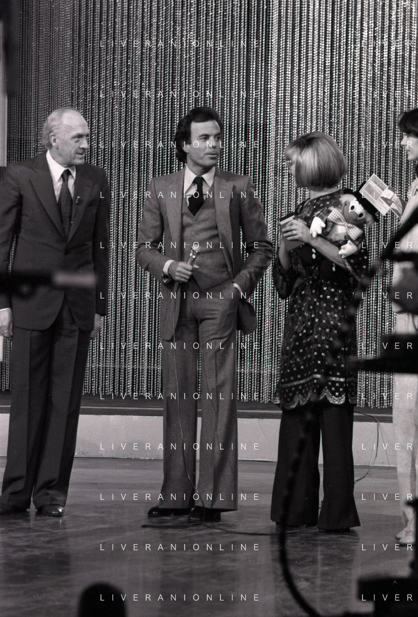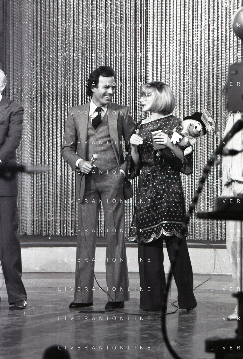 NEG-RETROSPETTIVA JULIO IGLESIAS CANTANTE NELLA FOTO JULIO IGLESIAS CON RAIMONDO VIANELLO E SANDRA MONDAINI NELLA TRASMISSIONE TELEVISIVA “IO E LA BEFANA“ NELL'ANNO 1976 AG ALDO LIVERANI SAS