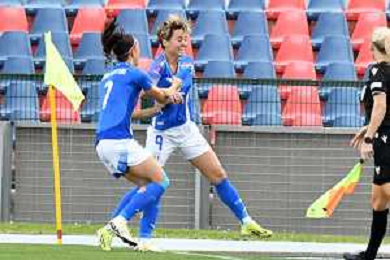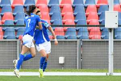 Foto Andrea Rosito 5 Aprile 2024 Cosenza, Italia calcio Italia vs Paesi - Women's European Qualifiers 2025 - Stadio San Vito-Gigi Marulla. Nella foto: Festa gol Agnese Bonfantini e Michela Cambiaghi AG ALDO LIVERANI SAS