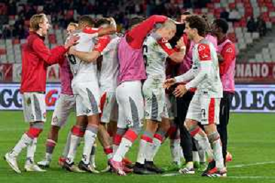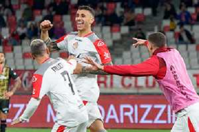TVEM Michele Collocolo of US Cremonese celebrates after scoring a goal with teammates during the Italian Serie B match between SSC Bari vs US Cremonese on April 5, 2024 at the San Nicola stadium in Bari, Italy. Photo by Emmanuele Mastrodonato/agenzia Aldo Liverani sas /AGENZIA ALDO LIVERANI SAS