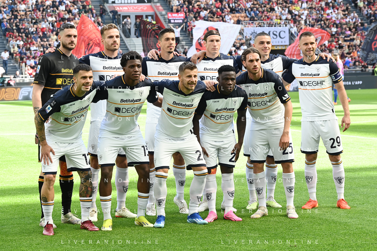 Milan vs Lecce nella foto formazione Lecce, in piedi da SX Wladimiro Falcone, Marin Pongracic, Joan Gonzalez, Federico Baschirotto, Nikola Krstovic e Alexis Blin; in basso da SX Lorenzo Venuti, Patrick Dorgu, Ylber Latif Ramadani, Lameck Banda e Antonio Gallo Milano 06-04-2024 Stadio Giuseppe Meazza - San Siro Campionato Serie A TIM - 31a giornata foto Roberto Garavaglia/Agenzia Aldo Liverani sas /AGENZIA ALDO LIVERANI SAS