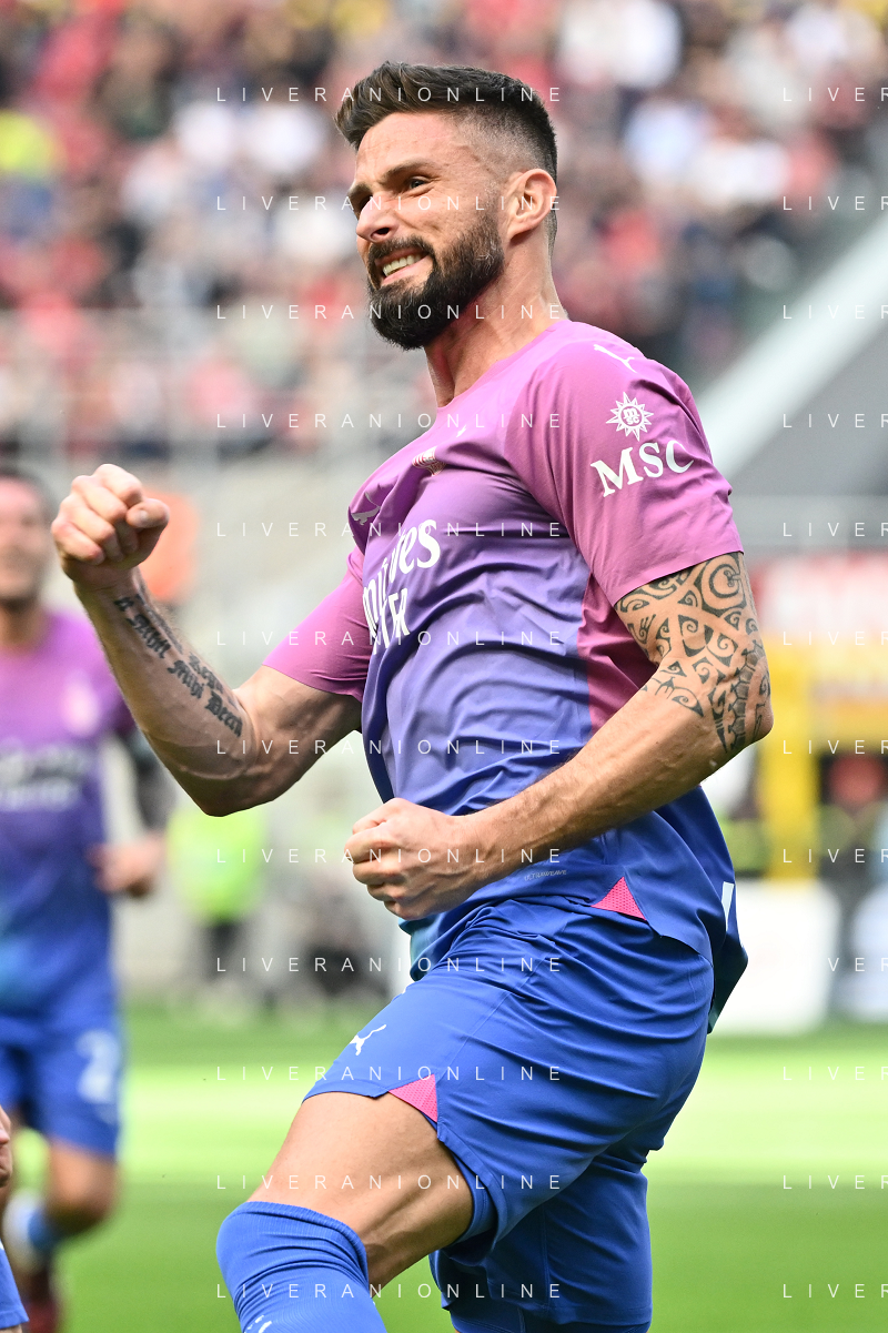 Milan vs Lecce nella foto Olivier Giroud (Milan) esulta dopo il gol del 2 a 0 Milano 06-04-2024 Stadio Giuseppe Meazza - San Siro Campionato Serie A TIM - 31a giornata foto Roberto Garavaglia/Agenzia Aldo Liverani sas /AGENZIA ALDO LIVERANI SAS