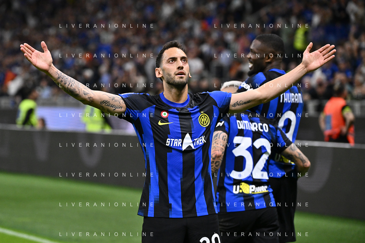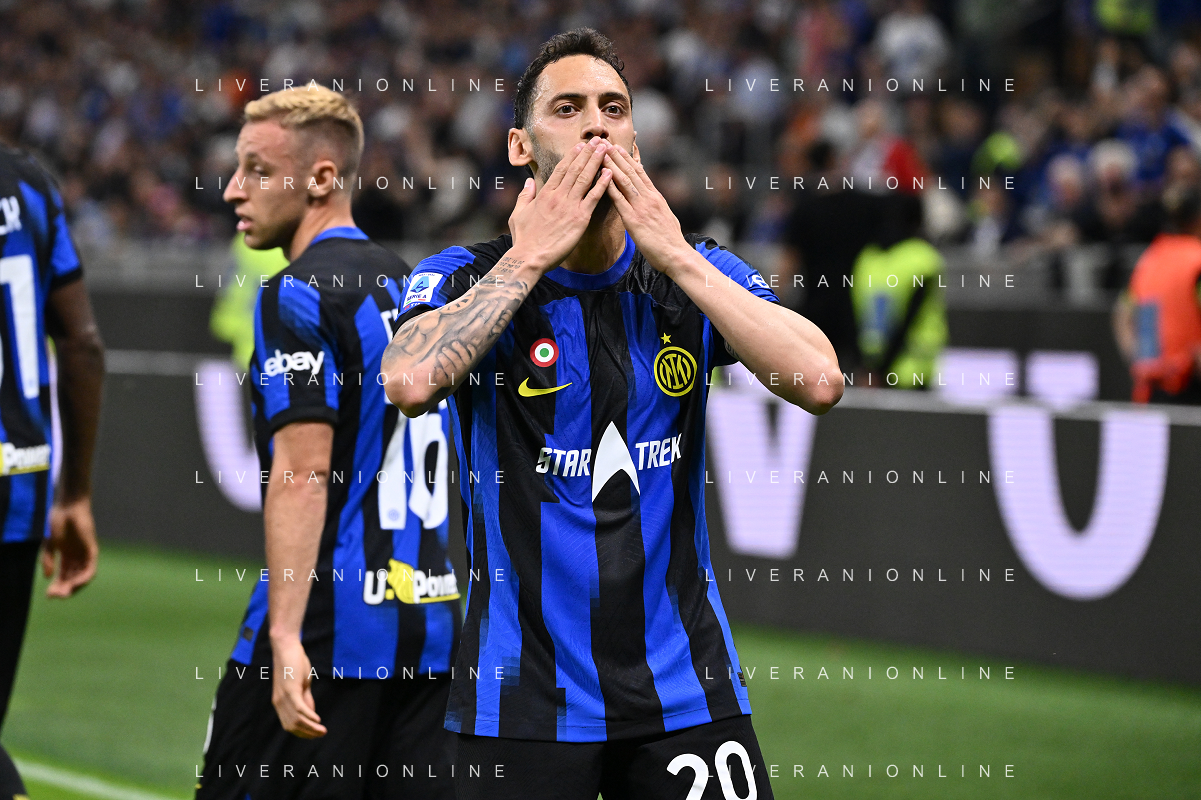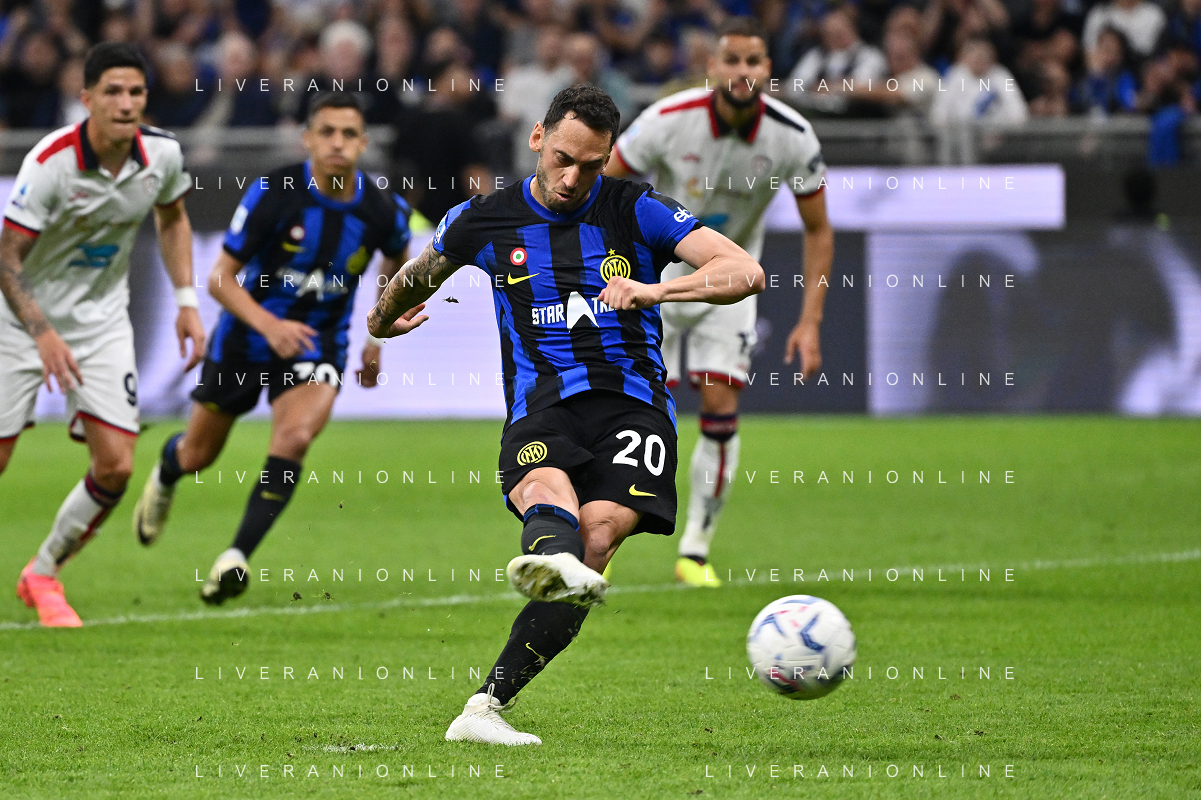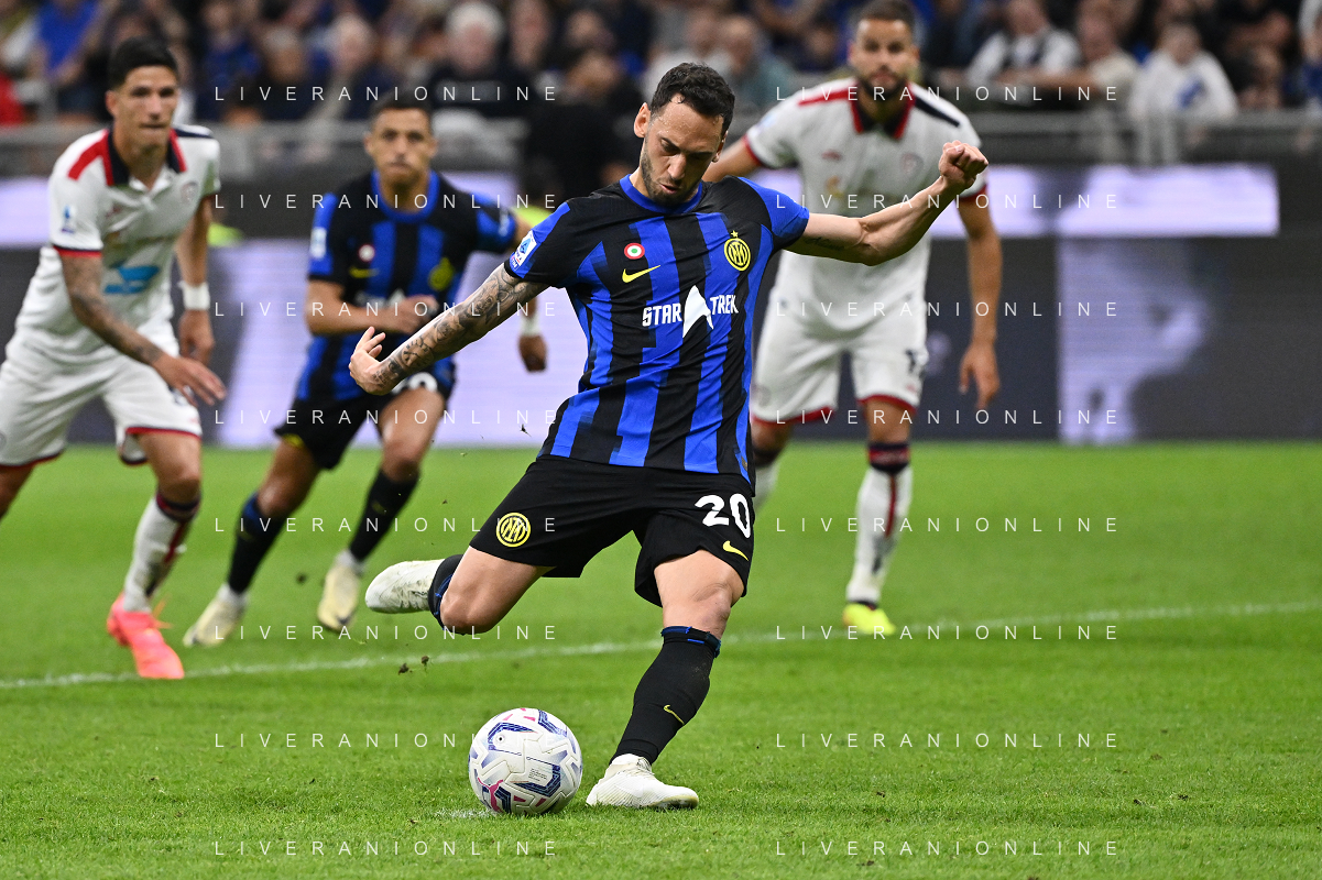 Inter vs Cagliari nella foto Hakan Calhanoglu (Inter) segna il gol del 2 a 1 Milano 14-04-2024 Stadio Giuseppe Meazza - San Siro Campionato Serie A TIM - 32a giornata foto Roberto Garavaglia/Agenzia Aldo Liverani sas/ AGENZIA ALDO LIVERANI SAS
