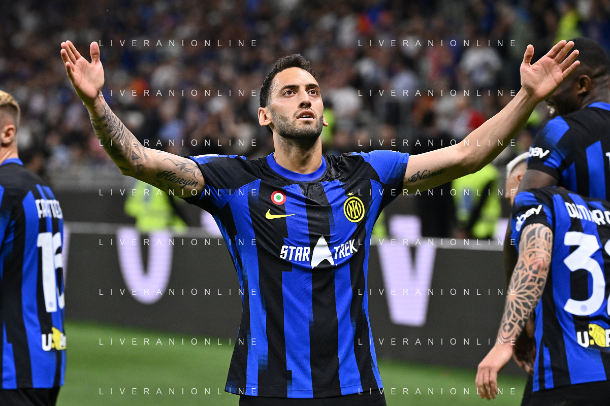Inter vs Cagliari nella foto Hakan Calhanoglu (Inter) esulta dopo il gol del 2 a 1 Milano 14-04-2024 Stadio Giuseppe Meazza - San Siro Campionato Serie A TIM - 32a giornata foto Roberto Garavaglia/Agenzia Aldo Liverani sas/ AGENZIA ALDO LIVERANI SAS