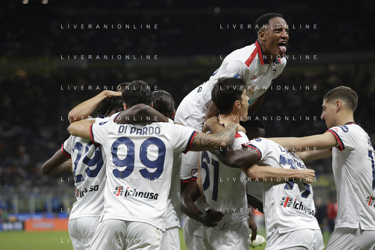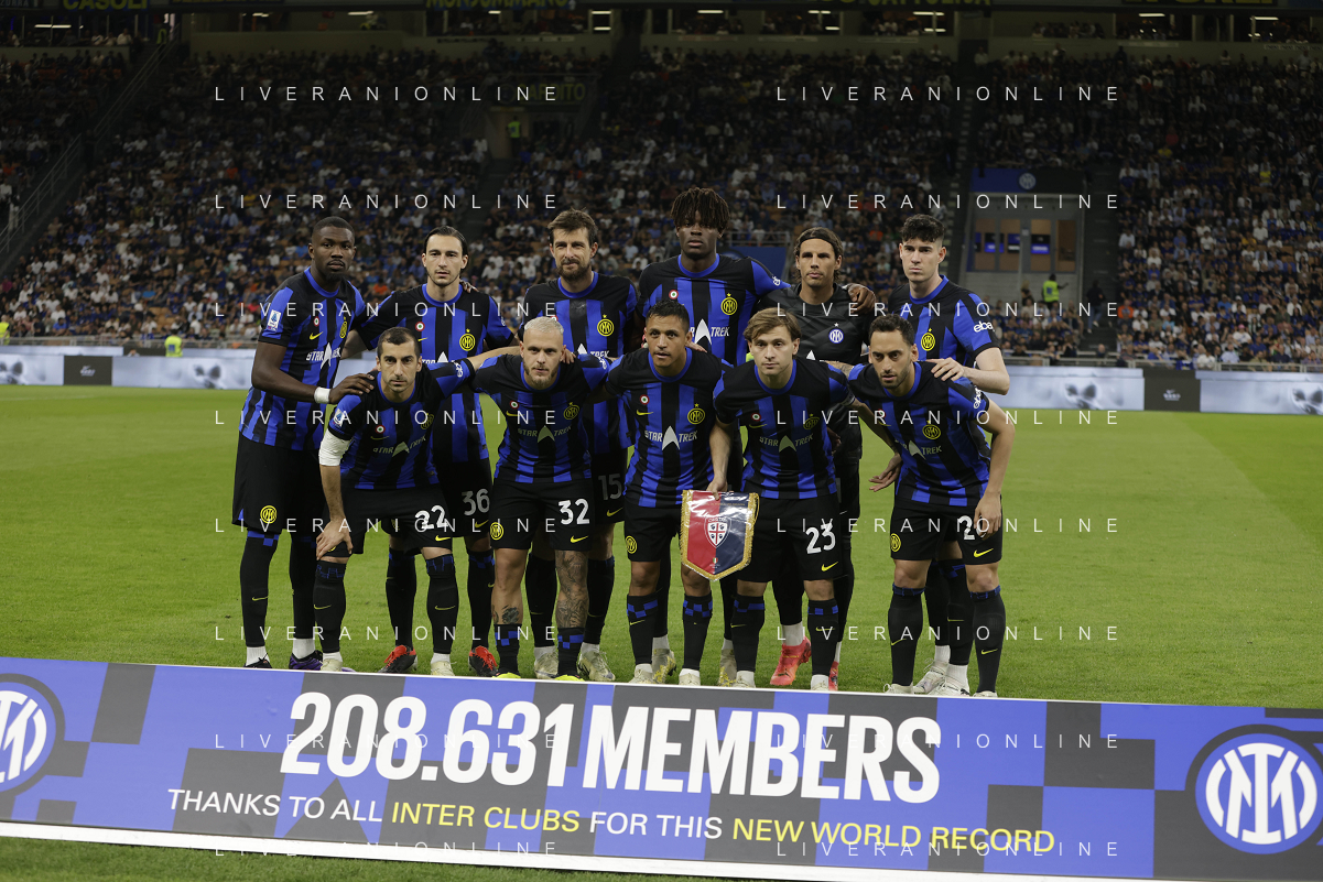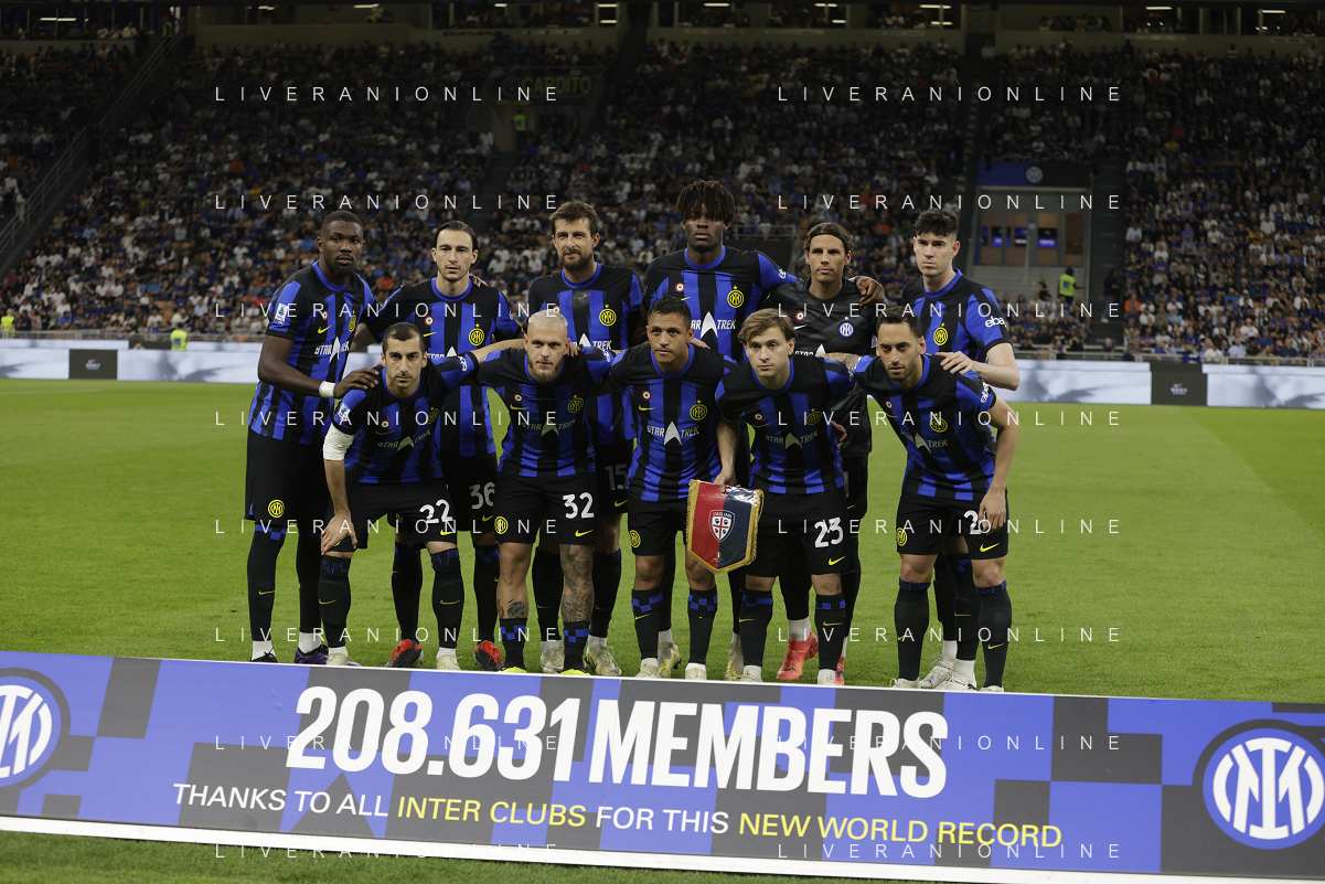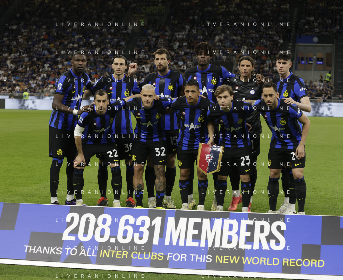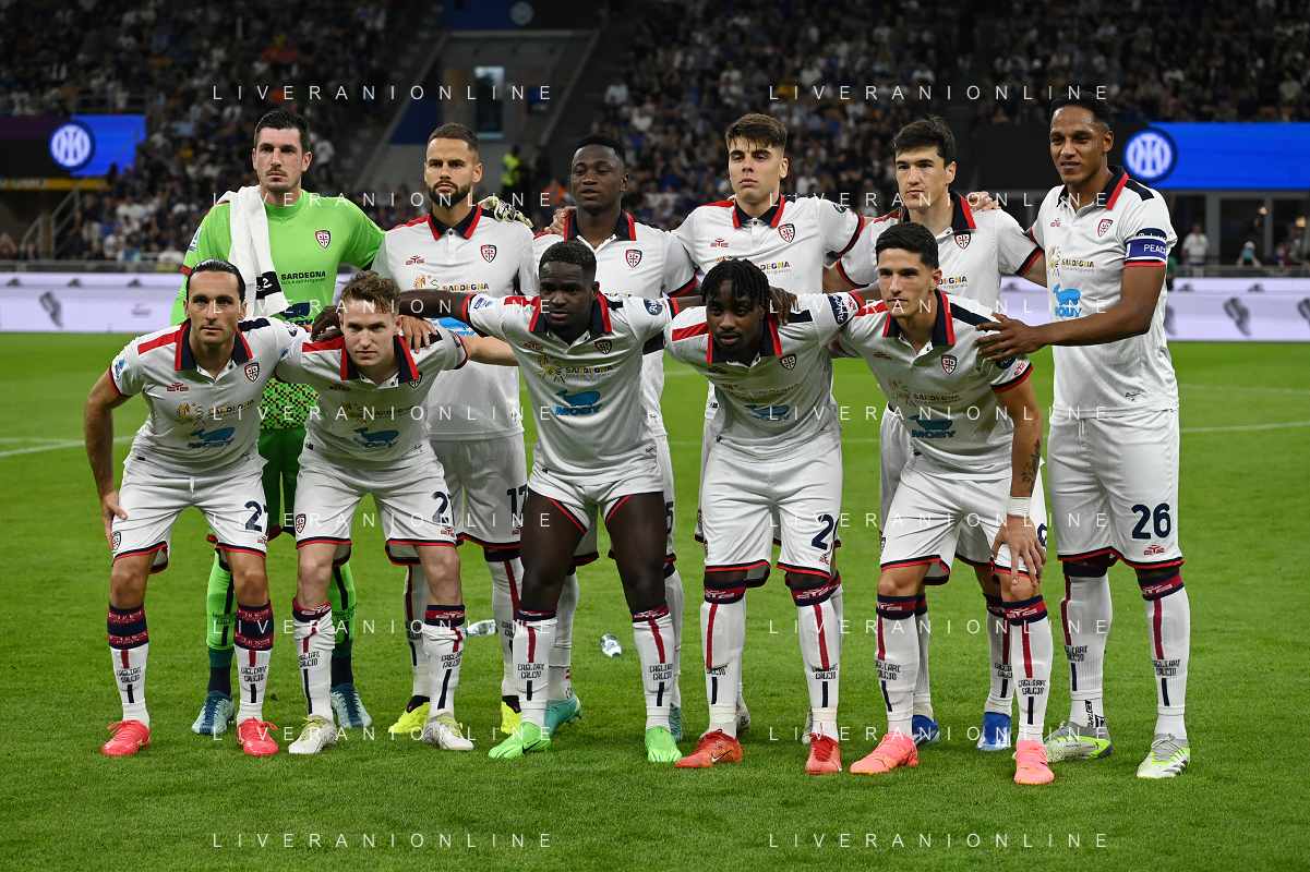 Inter vs Cagliari nella foto formazione Cagliari, in piedi da SX Simone Scuffet, Pantelis Hatzidiakos, Ibrahim Sulemana, Adam Obert. Eldor Shomurodov e Yerry Mina Gonzalez; in basso da SX Tommaso Augello, Jakub Jankto, Zito Andrè Luvumbo, Antoine Makoumbou e Alessandro Di Pardo Milano 14-04-2024 Stadio Giuseppe Meazza - San Siro Campionato Serie A TIM - 32a giornata foto Roberto Garavaglia/Agenzia Aldo Liverani sas