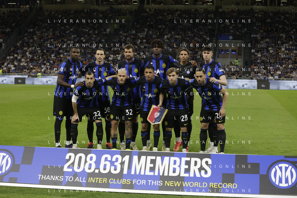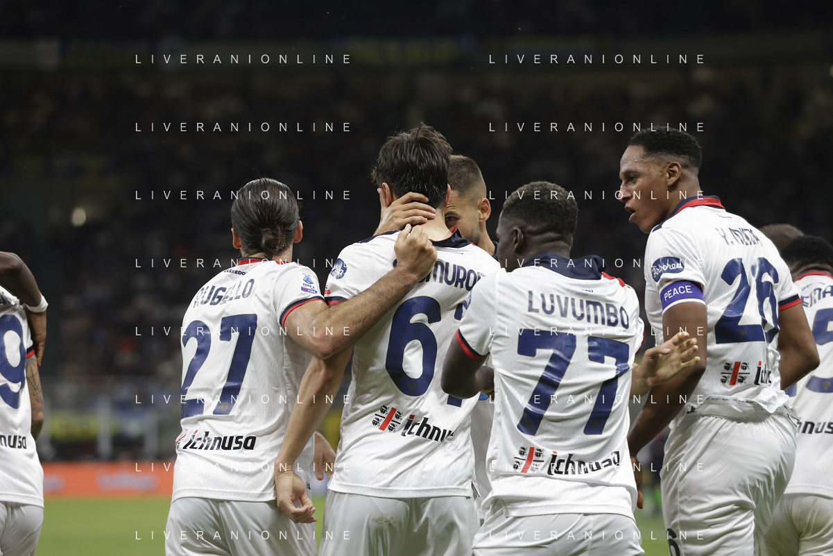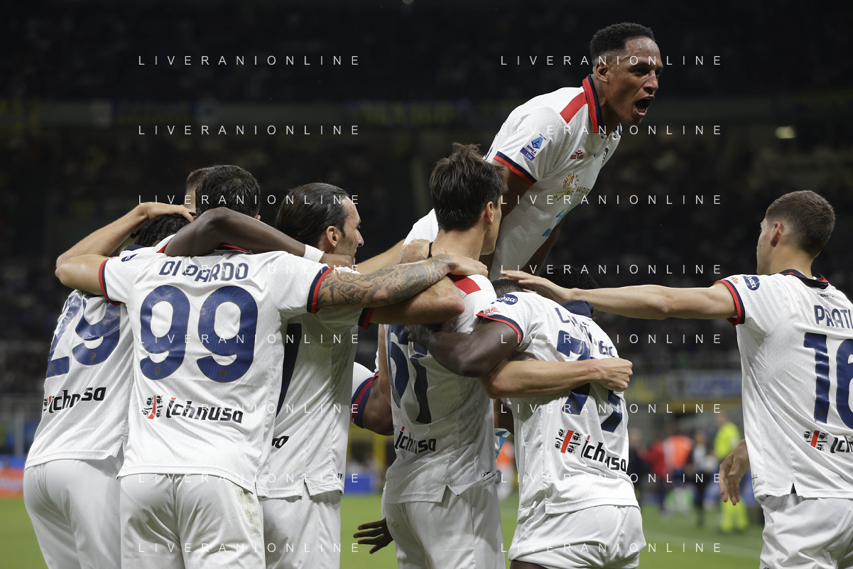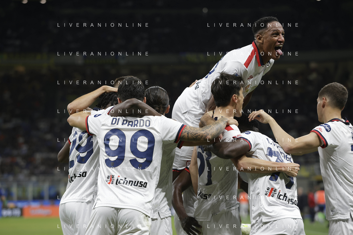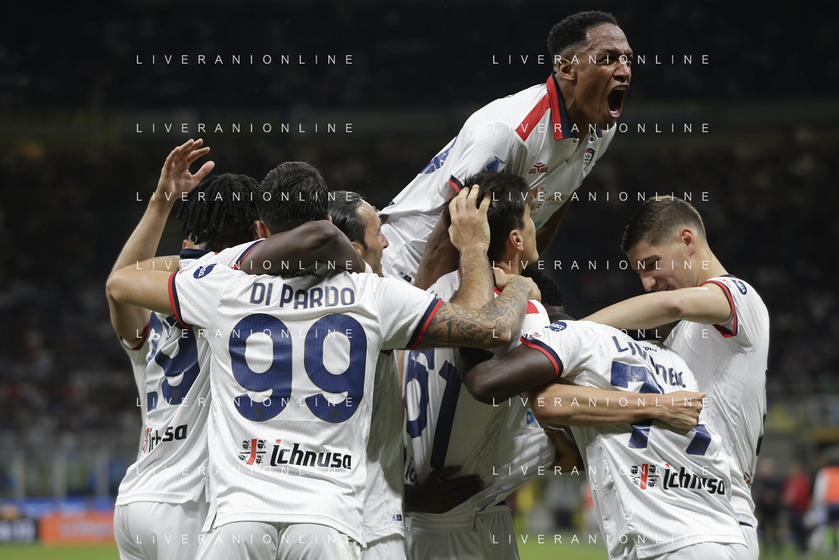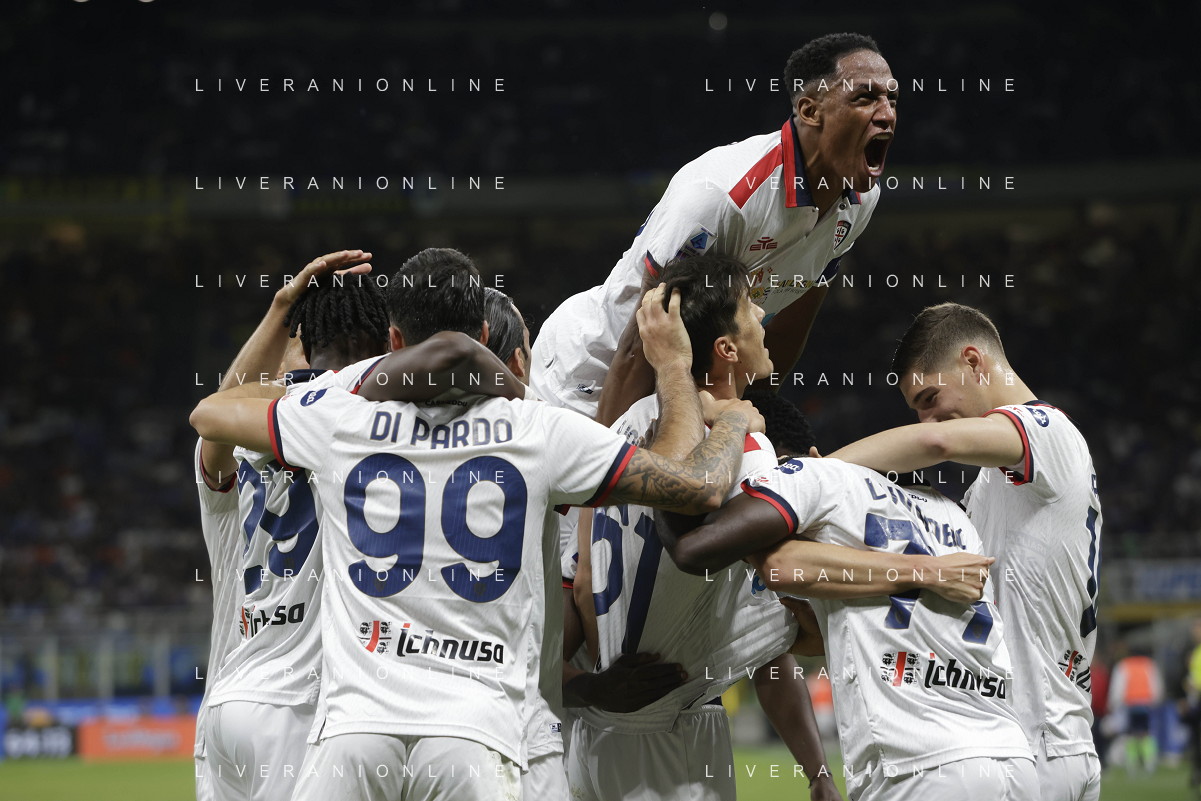 Inter vs Cagliari nella foto formazione Cagliari, in piedi da SX Simone Scuffet, Pantelis Hatzidiakos, Ibrahim Sulemana, Adam Obert. Eldor Shomurodov e Yerry Mina Gonzalez; in basso da SX Tommaso Augello, Jakub Jankto, Zito Andrè Luvumbo, Antoine Makoumbou e Alessandro Di Pardo Milano 14-04-2024 Stadio Giuseppe Meazza - San Siro Campionato Serie A TIM - 32a giornata foto Roberto Garavaglia/Agenzia Aldo Liverani sas
