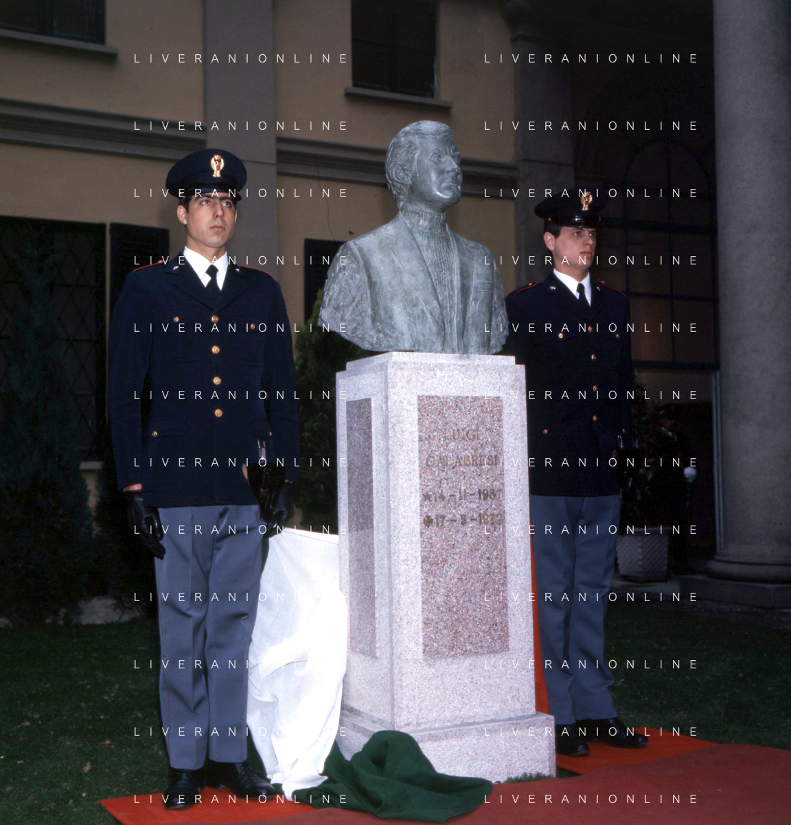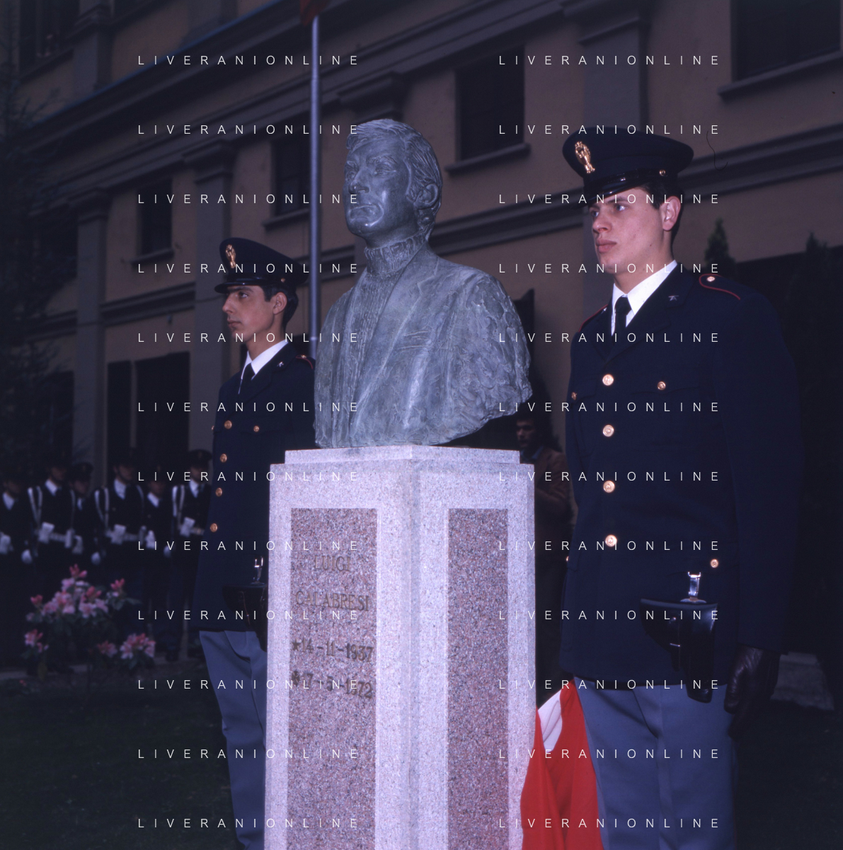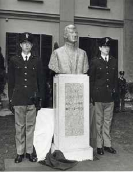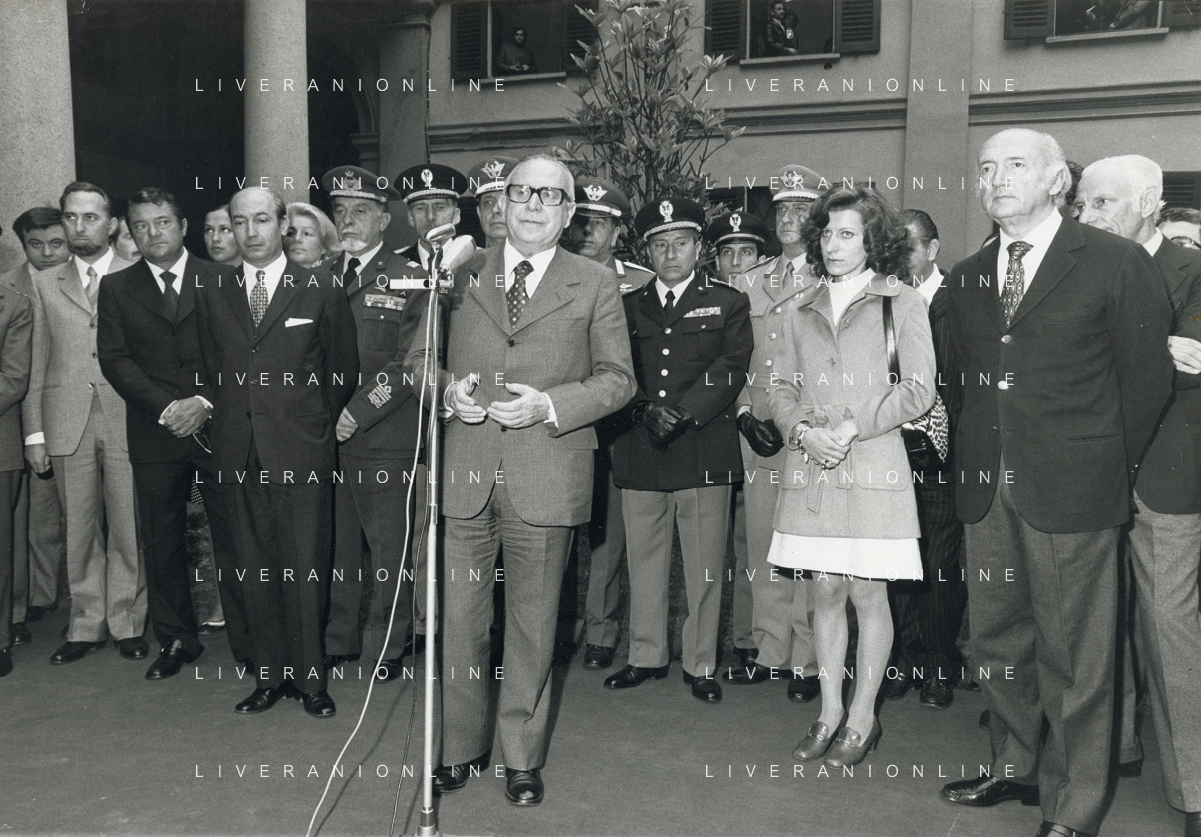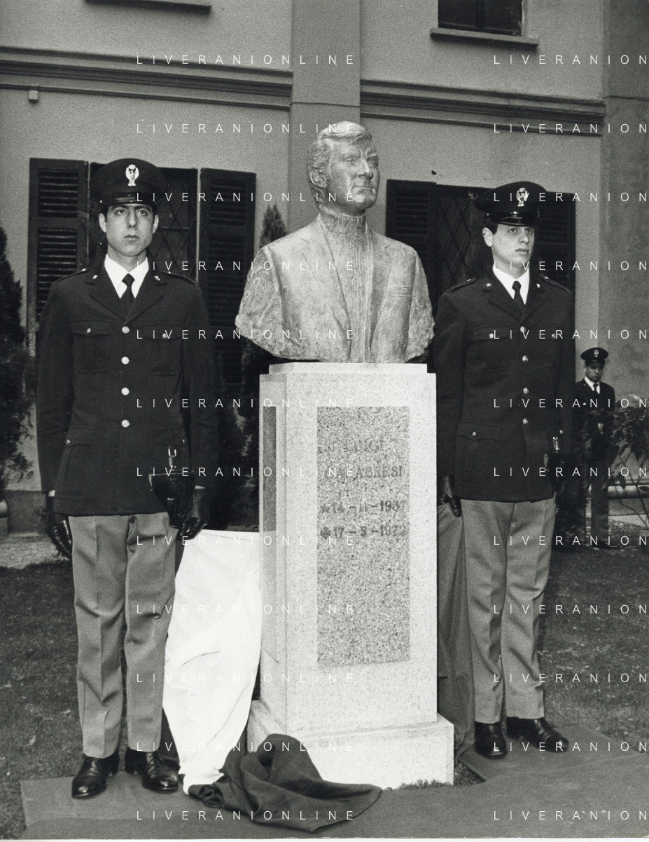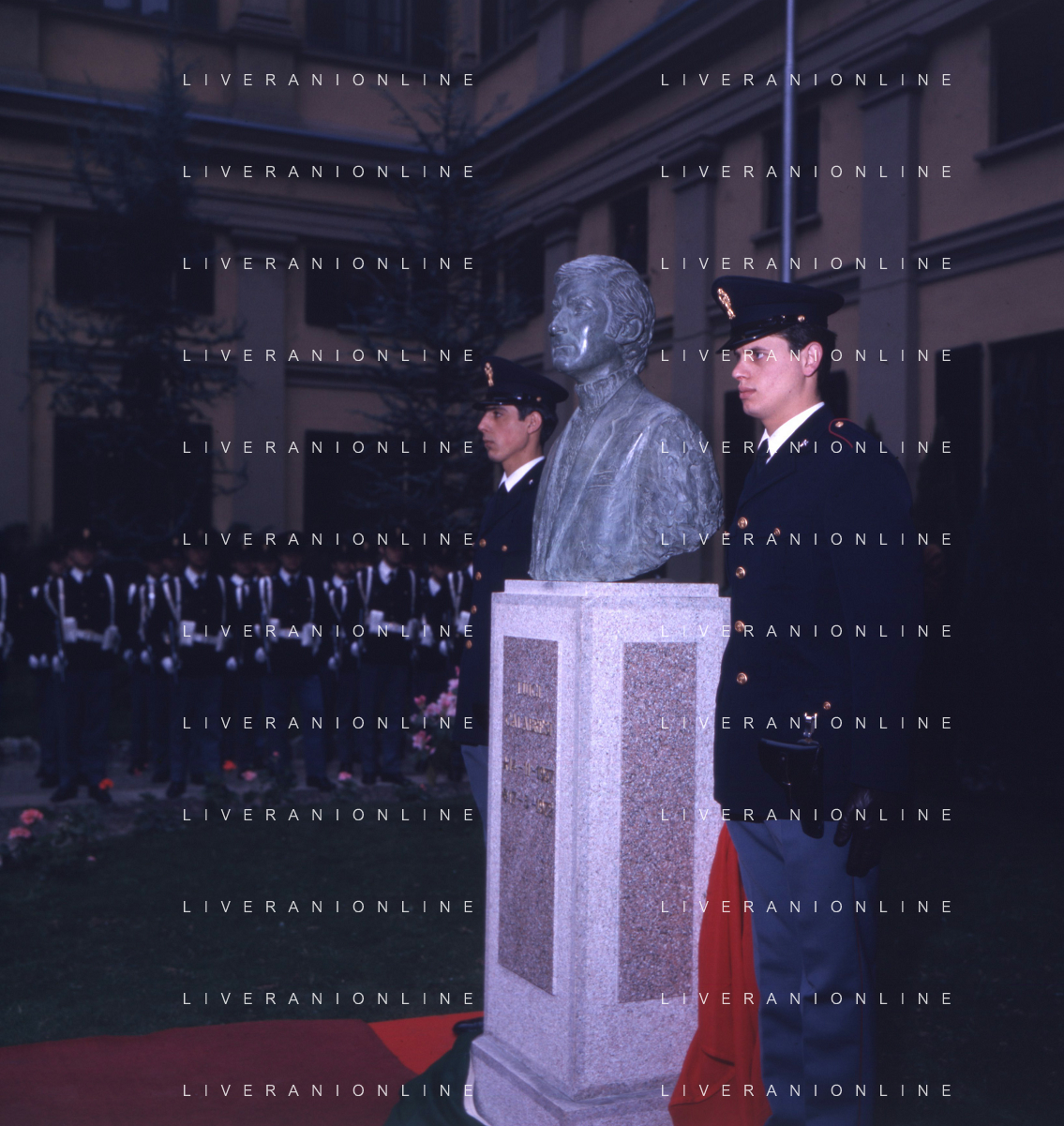 COL-MILANO 17 maggio 1973,, a un anno dall'assassinio, si tenne l'inaugurazione di un busto commemorativo in memoria del commissario nel cortile della Questura di Milano. Alla cerimonia partecipò l'allora Ministro dell'Interno Mariano Rumor. Durante la cerimonia l'anarchico Gianfranco Bertoli lanciò una bomba a mano tra i partecipanti. L'esplosione uccise 4 persone e ne ferì 52, ma non colpì Rumor, indicato come probabile obiettivo. Bertoli rivendicò l'azione come vendetta per la morte di Pinelli urlando: «Morirete tutti come Calabresi e ora uccidetemi come Pinelli nella foto mariano rumor e emma calabresi AG ALDO LIVERANI SAS