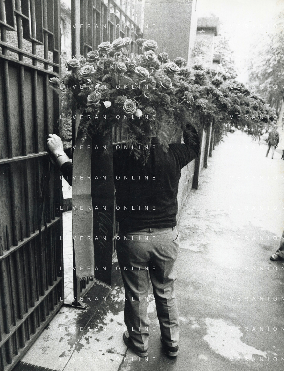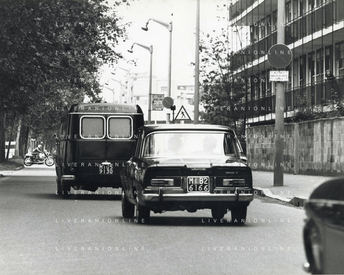 ST-MILANO 17-05-1972 OMICIDIO DEL COMMISSARIO DI POLIZIA LUIGI CALABRESI NELLA FOTO IL CARRO FUNEBRE CON IL CORPO DEL COMMISSARIO LUIGI CALABRESI LASCIA L'OSPEDALE AG ALDO LIVERANI SAS