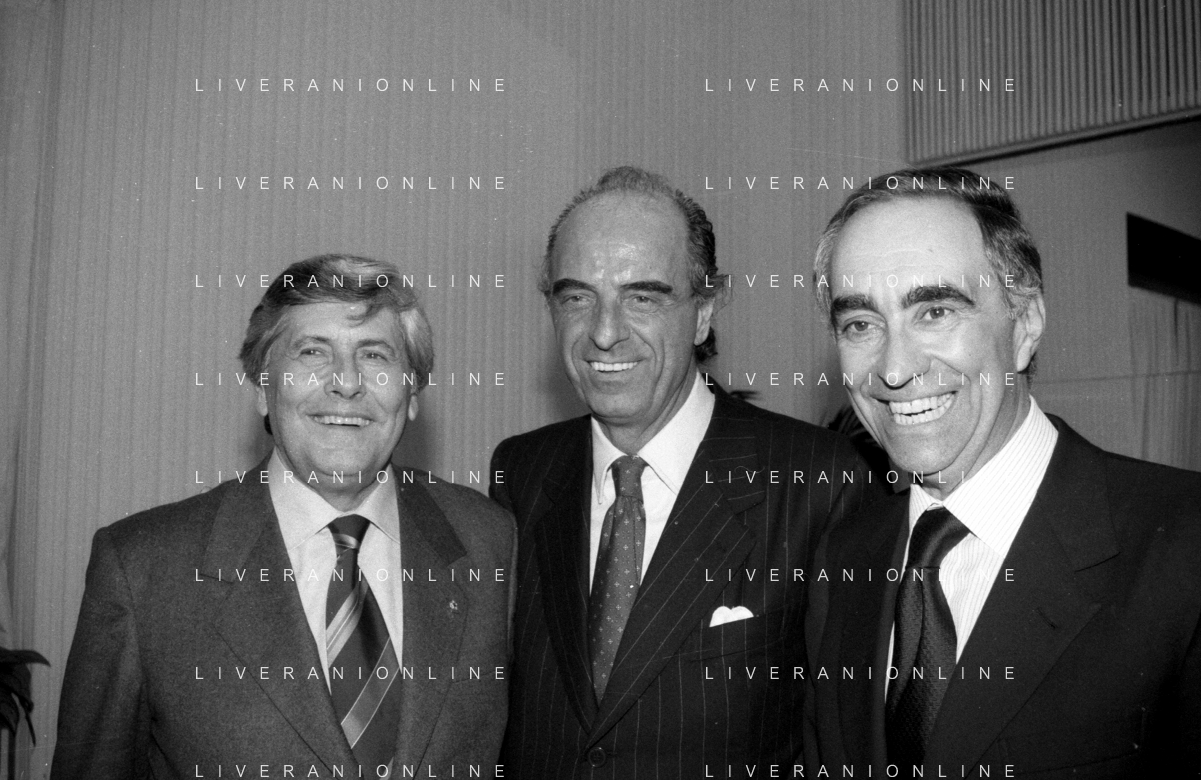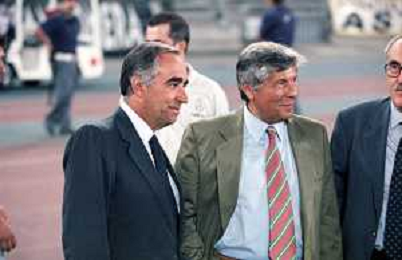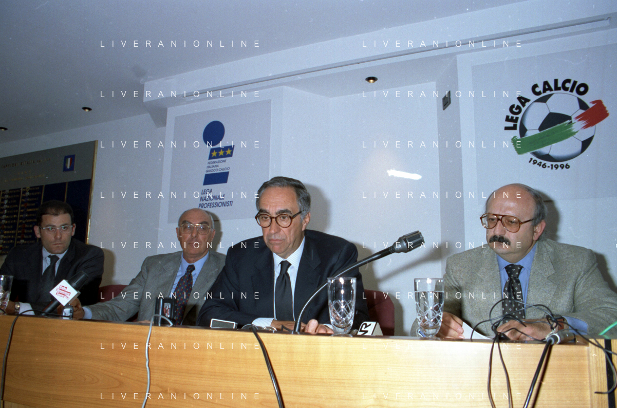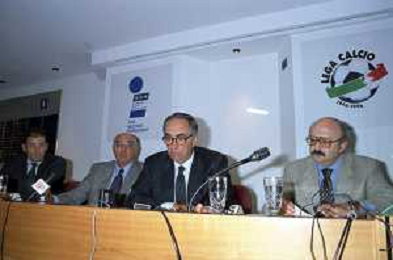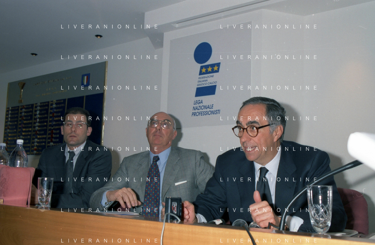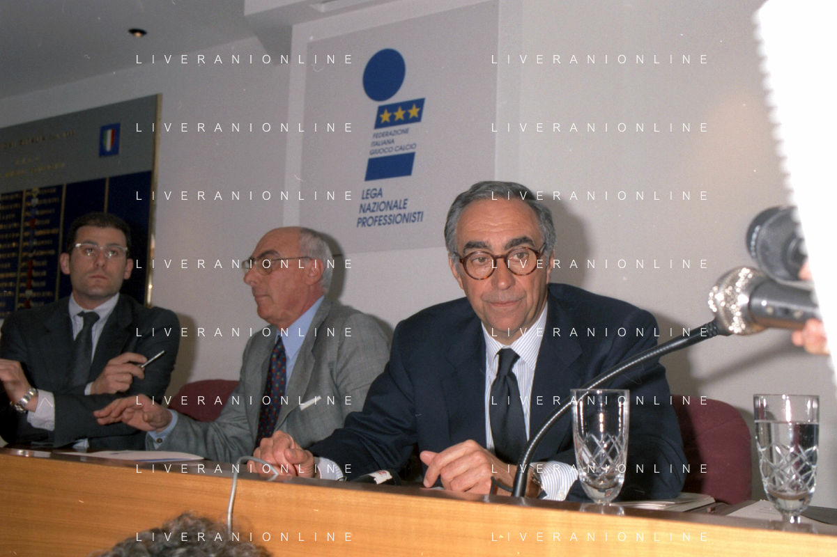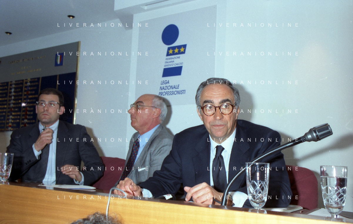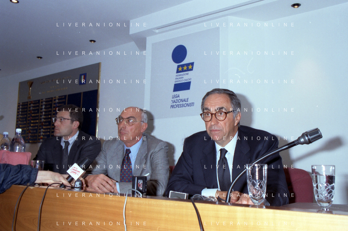 Neg- RETROSPETTIVA FRANCO CARRARO DIRIGENTE SPORTIVO E POLITICO NELLA FOTO FRANCO CARRARO PRESIDENTE FEDERCALCIO CON LUCIANO NIZZOLA E MARIO PESCANTE NELL'ANNO 1997-1998 AG ALDO LIVERANI SAS